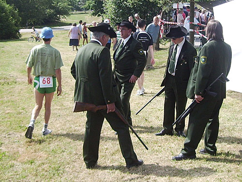 Den Startschuss zum schwersten 24-Stundenlauf in Europa gibt um 10 Uhr ein Schützenverein mit Gewehrfeuer. Die Staffelläufer schießen vorbei wie die Windhunde. Eine rote Nummer ist noch nicht vorbeigekommen, oder habe ich eine übersehen. Na, was soll’s! Im Training habe ich mich gezwungen, langsam zu laufen – es ging nur bedingt! Was hab ich nicht unternommen, um mal einen Schnitt über 6:30 Minuten hinzubringen: Mit Trinkrucksack auf dem Rücken bin ich gelaufen. Selbst das war dann schneller… Ich konnte nicht anders – ich lief mein Wohlfühltempo und ich wusste, dass dieses Tempo irgendwann von ganz allein langsamer werden würde...
