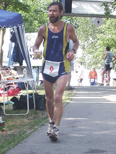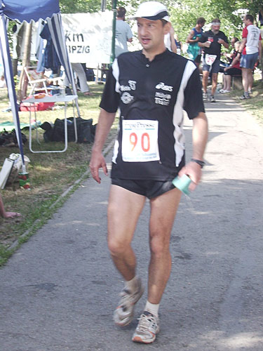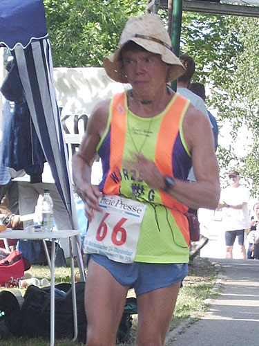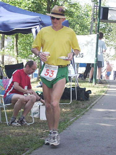Auf diese Erfahrung, die ich ansatzweise beim Bieler Hunderter machen konnte, war ich schon gespannt. Unbekümmert lief ich Runde um Runde. 10 Runden waren nach 1:50 absolviert – der erste Halbmarathon. Die Sonne brannte heiß: Bis 29°C waren gemeldet worden. Zu meiner Freude hatten sich meine Eltern im Verpflegungsbereich eingefunden, um tatsächlich in dieser sengenden Hitze 3 Stunden an der Strecke das Geschehen zu verfolgen. Und da gab es doch sehr eigenartige Laufstile zu bewundern, die ich noch nicht zuvor gesehen hatte. Jeder hatte da wohl sein Rezept, was die Technik betraf. Auch die Outfits waren teilweise verwegen: Strohhüte, teilweise mit Blumenschmuck, lange Laufhosen bei Tag – kurze dann in der Nacht, Röcke – alles war vertreten – ein wirklich buntes Völkchen bildeten die 24-Stundenläufer von Reichenbach, die auch eine gewisse fröhliche Stimmung verbreiteten, die nicht unbemerkt blieb. Ein Unikum - Günther Menzel - zum zehnten Mal dabei, mit einem Rauschebart, der allein schon eine gute Laune und stoische Ruhe erzeugte, von der man sich gern anstecken ließ.