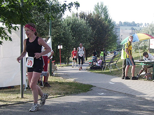 An manchen Häuserblocks staute sich die Hitze. Duftende Beetblumen nehmen einem den Atem. An schattiger Stelle verbreitet ein Pfeifenstrauch seinen intensiven Duft, der jedoch weit angenehmer zu ertragen ist. Die mitleidigen Blicke der Anwohner helfen da nicht wirklich gegen die knallende Sonne, aber einige ergreifen die Initiative und stellten uneigennützig ein paar Waschschüsseln mit Wasser oder Trinkbecher auf Tischen bereit, was von den Läufern zahlreich und dankend angenommen wird, obwohl die Runde ja ziemlich kurz ist und man so relativ schnell an Start und Ziel und der dort befindlichen Verpflegungsstelle vorbeikommt.
