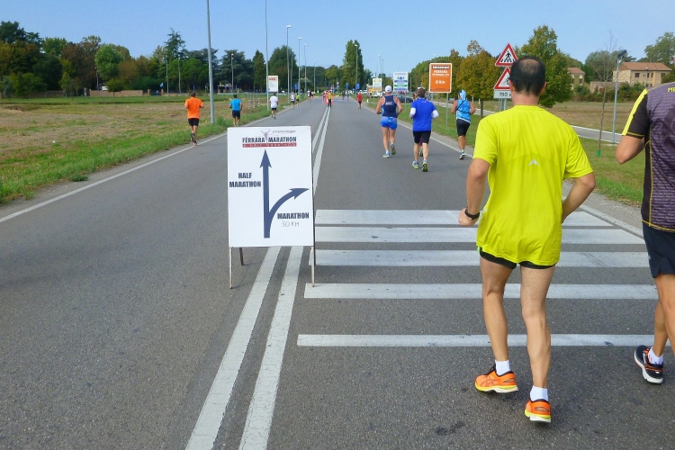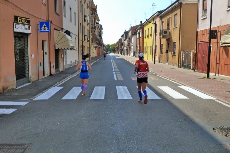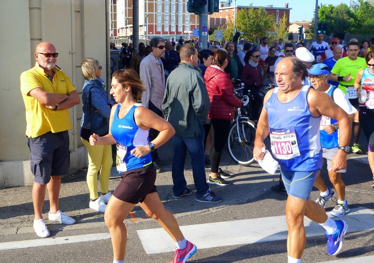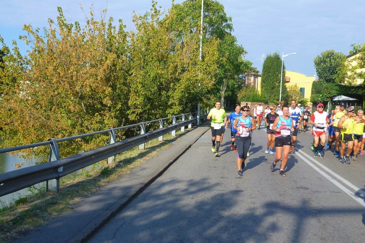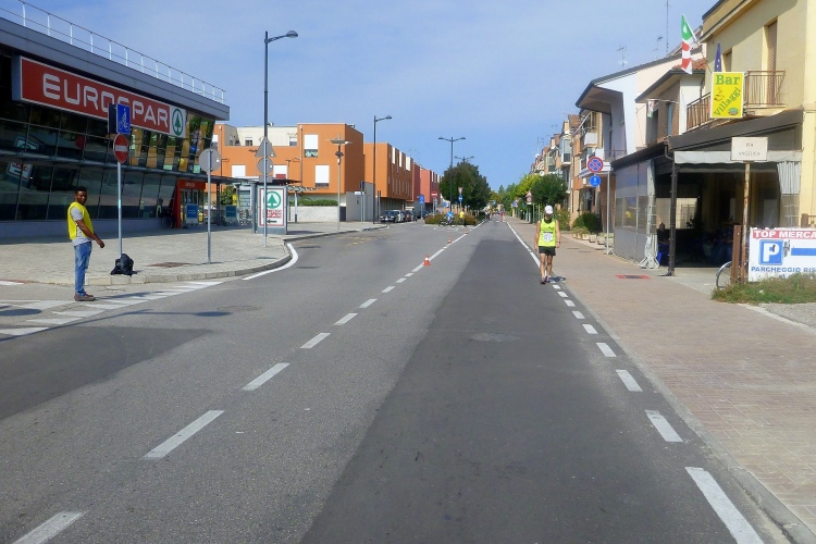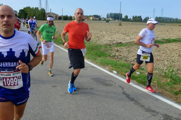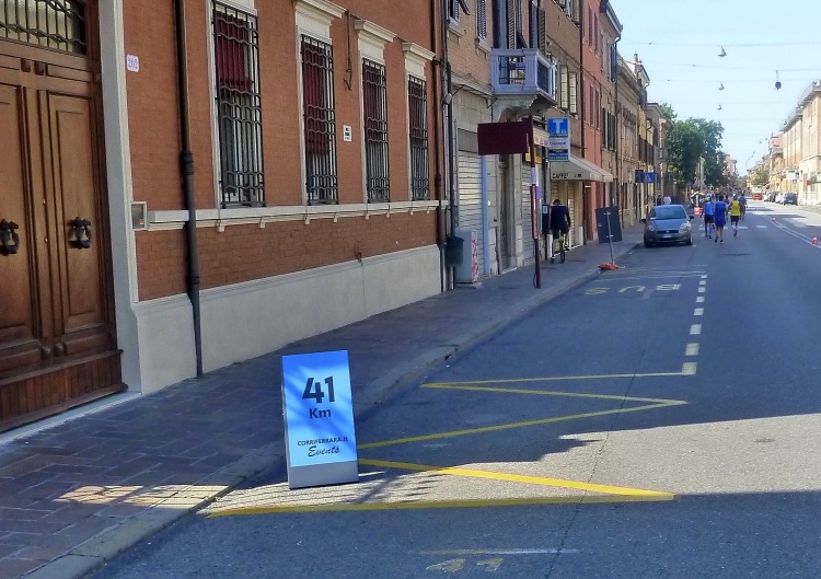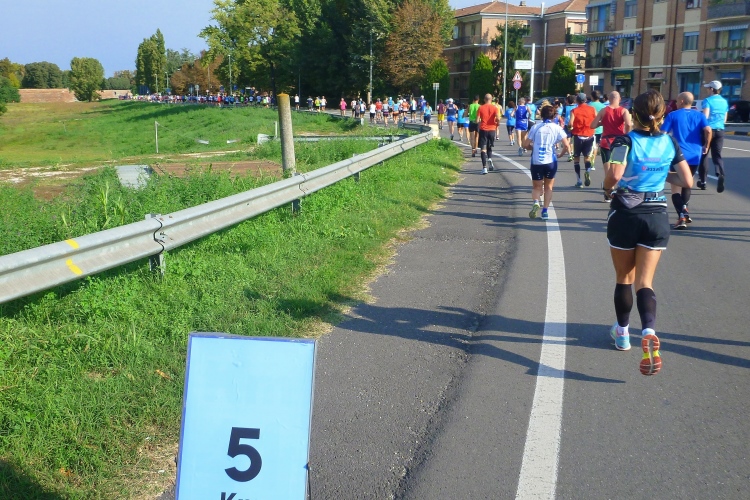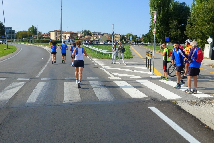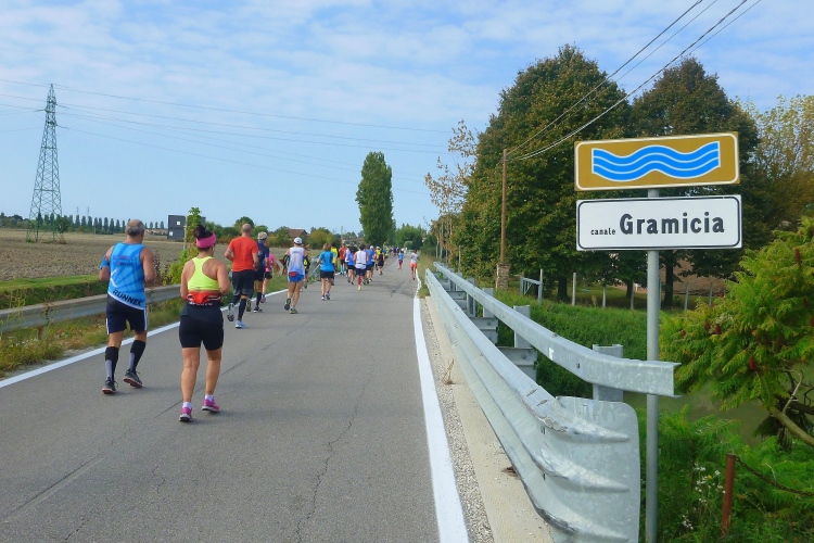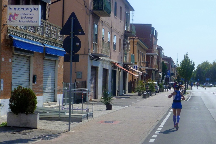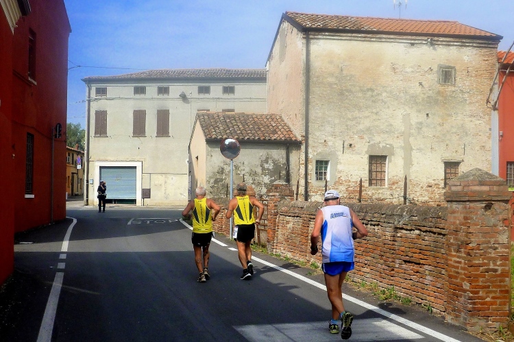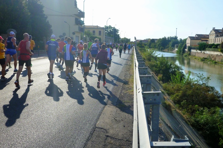 Im Fluss verläuft die Grenze zwischen der Emilia-Romagna (da sind wir) und Venetien. Ein Stück weiter gibt es sogar ein Dreiländereck. Da beginnt ein Zipfelchen der Lombardei. Alle drei sind sehr reiche Regionen Italiens. Wir erreichen Pontelagoscuro (Brücke über den dunklen See). Helfer weisen der inzwischen recht losen Perlenkette aus einzelnen Sportlern den Weg. Eine lange Straße gesäumt von Häusern, kein Lebenszeichen. Vielleicht halten die Bewohner gerade einen Mittagsschlaf. Einige Ordner sorgen für Stimmung, feiern jeden Läufer. Unter der Bahn durch, km 35. Wir sind wieder in Ferrara. Judith und ich haben die asiatische Läuferin wieder eingeholt.