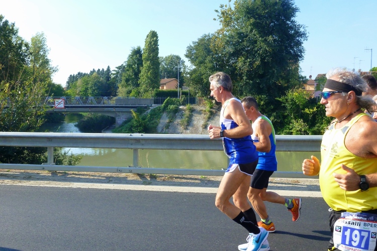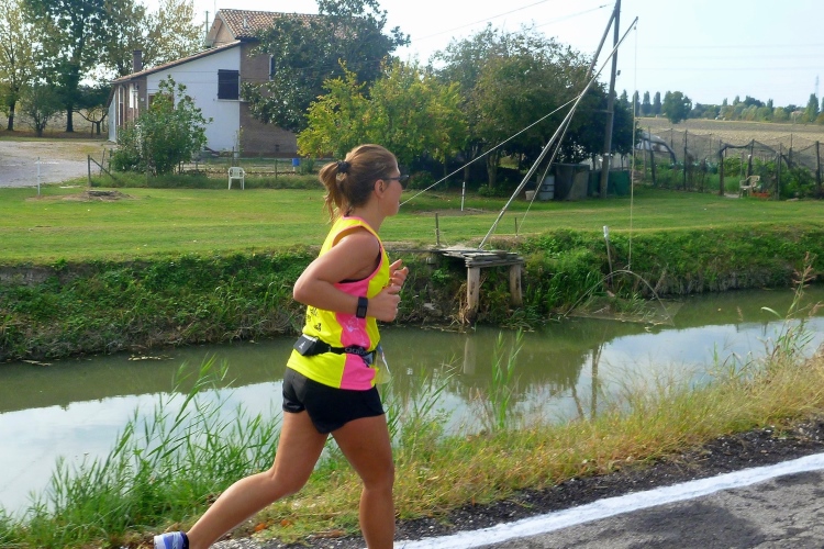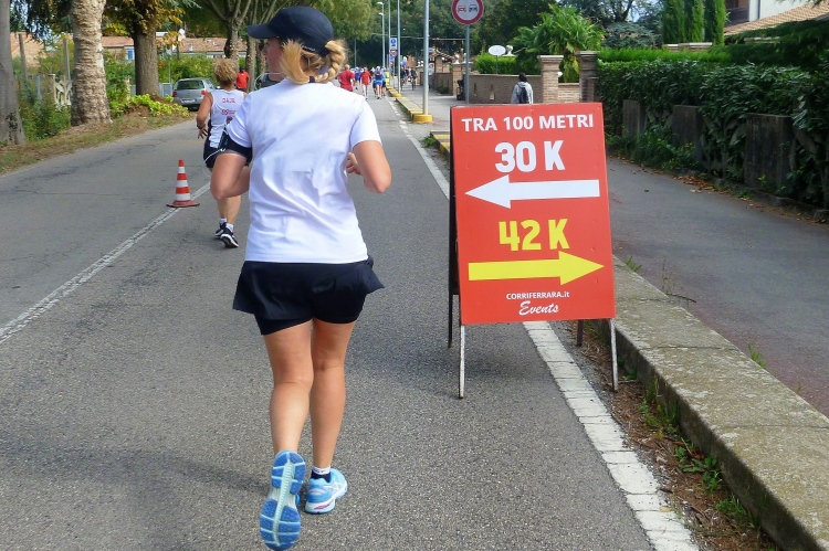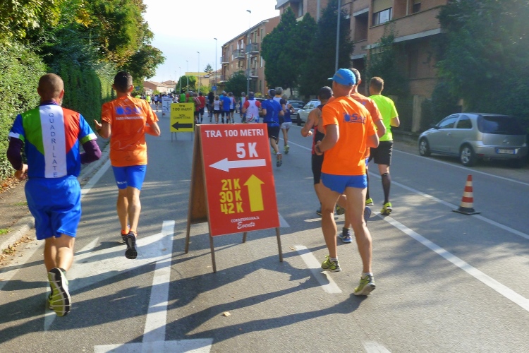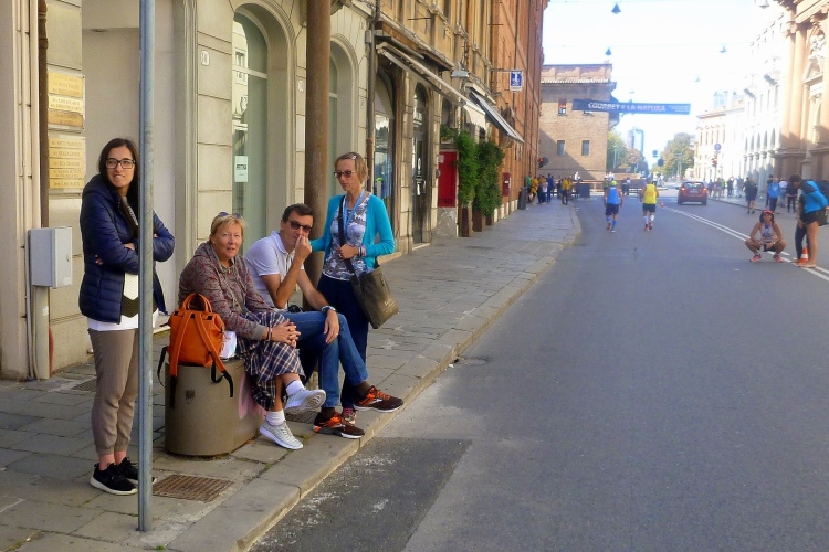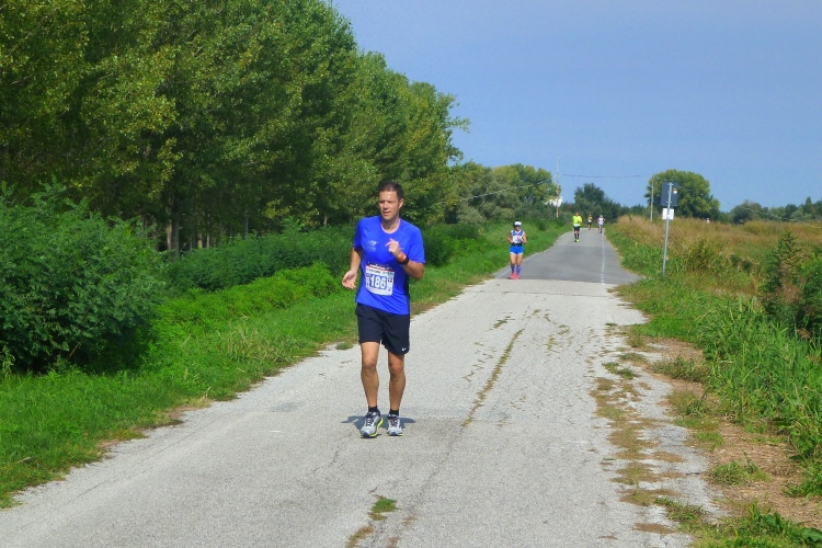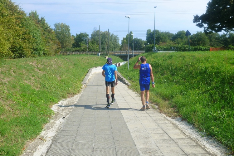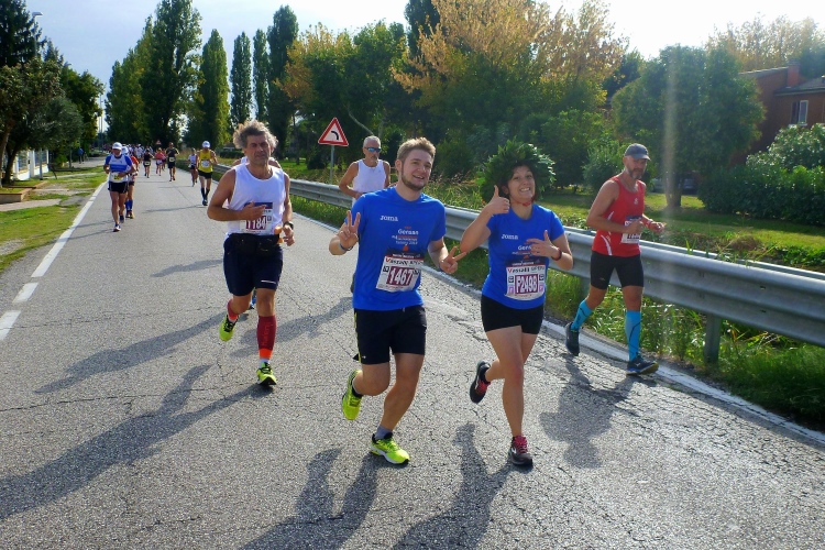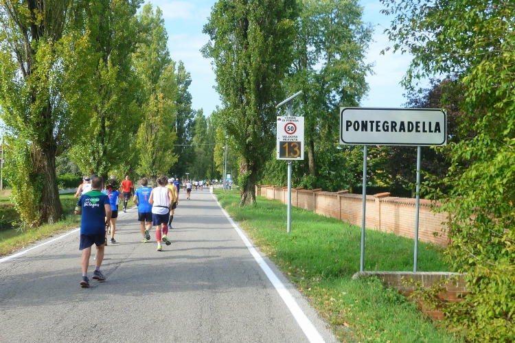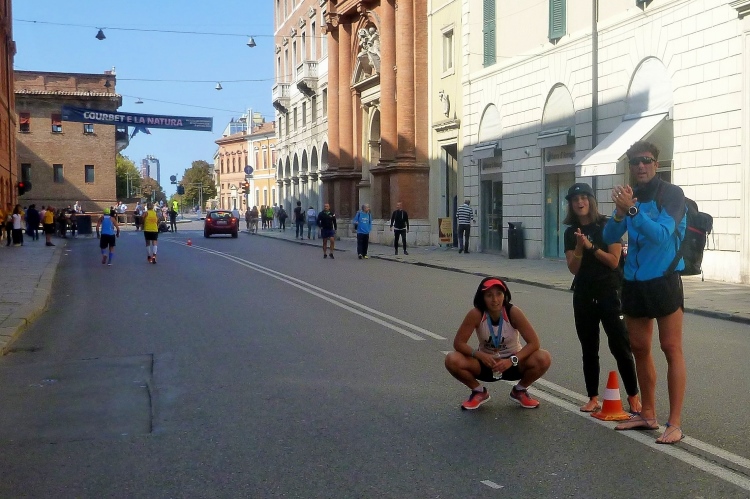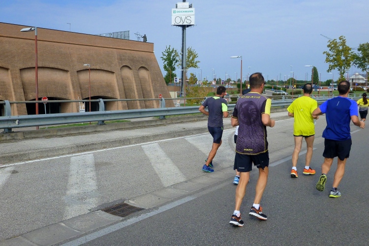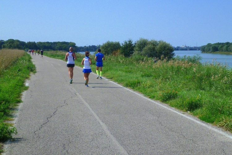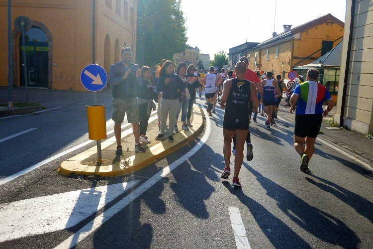 Im Fluss verläuft die Grenze zwischen der Emilia-Romagna (da sind wir) und Venetien. Ein Stück weiter gibt es sogar ein Dreiländereck. Da beginnt ein Zipfelchen der Lombardei. Alle drei sind sehr reiche Regionen Italiens. Wir erreichen Pontelagoscuro (Brücke über den dunklen See). Helfer weisen der inzwischen recht losen Perlenkette aus einzelnen Sportlern den Weg. Eine lange Straße gesäumt von Häusern, kein Lebenszeichen. Vielleicht halten die Bewohner gerade einen Mittagsschlaf. Einige Ordner sorgen für Stimmung, feiern jeden Läufer. Unter der Bahn durch, km 35. Wir sind wieder in Ferrara. Judith und ich haben die asiatische Läuferin wieder eingeholt.