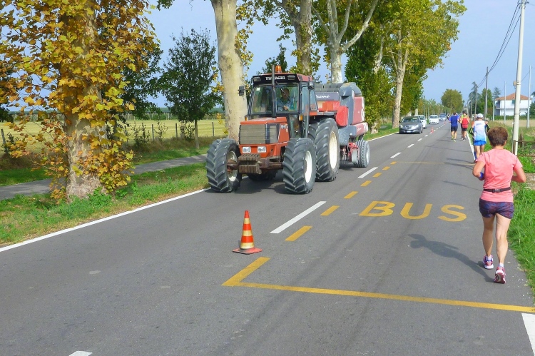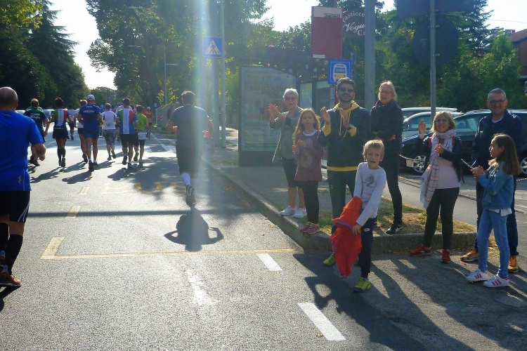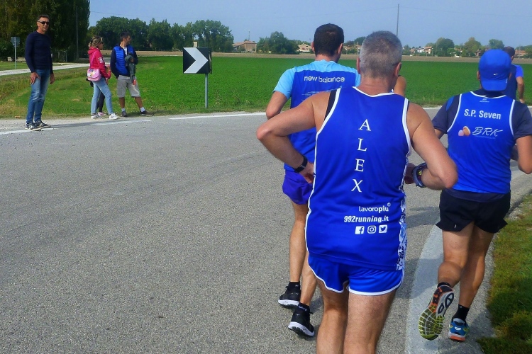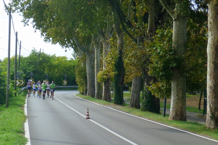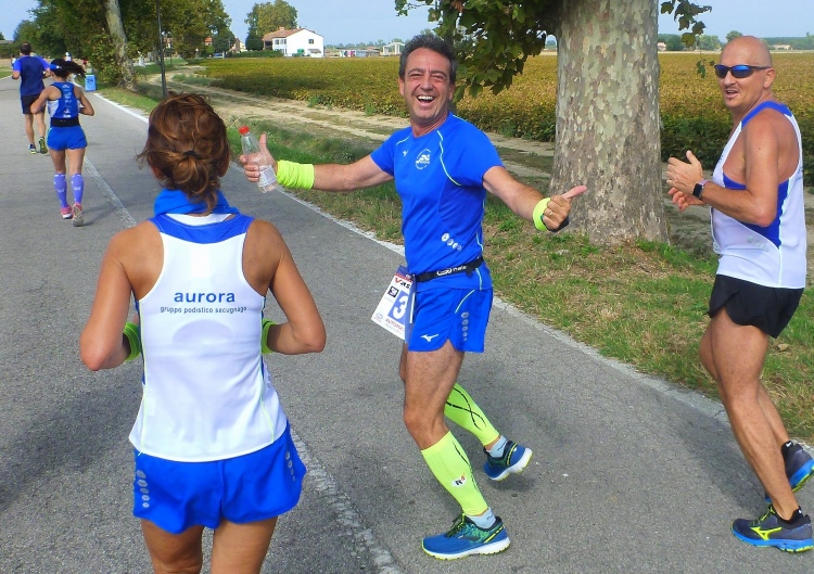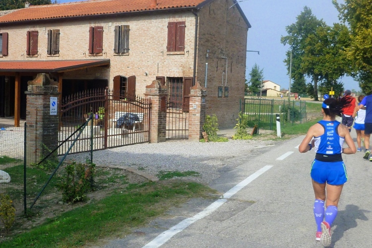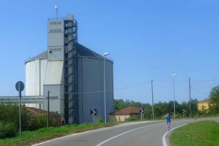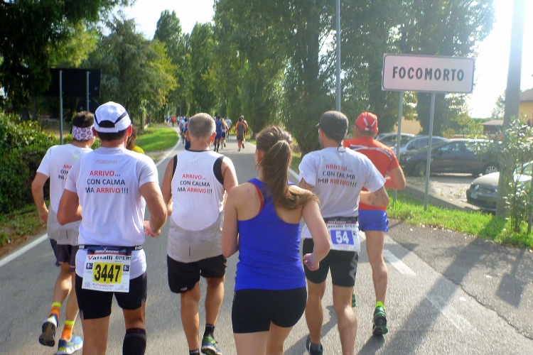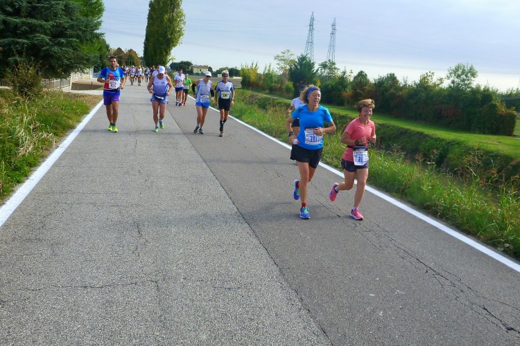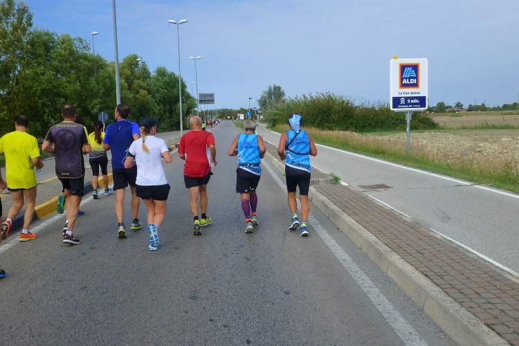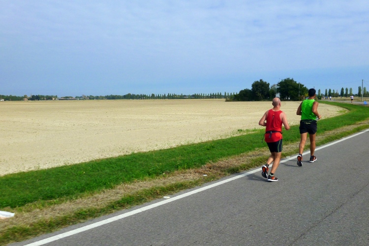 Die Umgebung ist abwechslungsreich, viele Villen und dazwischen Bauernhöfe. Vor einem steht eine Bäuerin, womöglich dieselbe wie vor sechs Jahren. An dem Sträßchen Alleebäume, meist Platanen mit ihrem unverwechselbaren Geruch. Die abgefallenen Blätter knirschen wie hartes Papier. Ich versuche die Ideallinie zu laufen. Die Felder sind riesig und frisch gepflügt. Sieht aus wie ein großer Sandkasten – unendlich weit. Und es ist wirklich flach in der Po-Ebene. Man glaubt fast, die Läufer bis ins Ziel sehen zu können. Ganz in der Ferne kann man den großen Damm erkennen. Bei Kilometer 26 sind wir in Francolino. Zuschauer, Musikgruppe, Goaßlschnalzer – Fehlanzeige. Wahrscheinlich stehen alle im Stau auf dem Weg zum Einkaufszentrum. Sferzino könnte Goaßlschnalzen auf Italienisch heißen, wenigstens meint das Davide, ein italienischstämmiger Südtiroler Läufer.