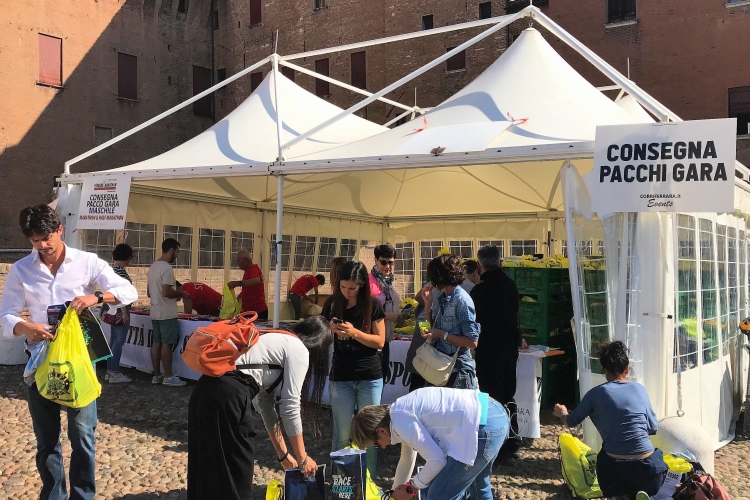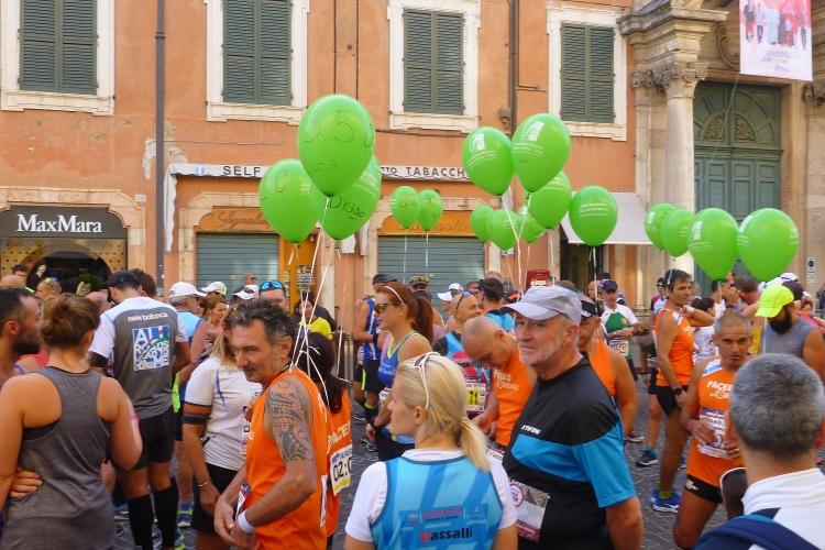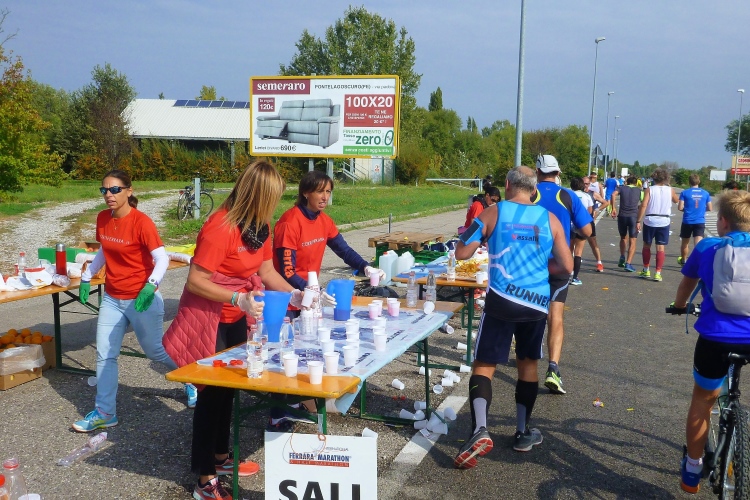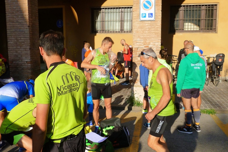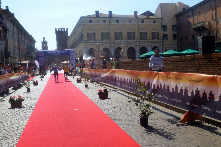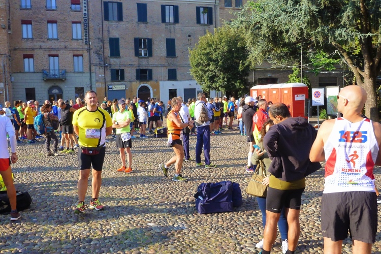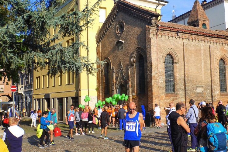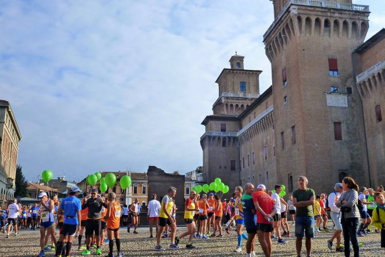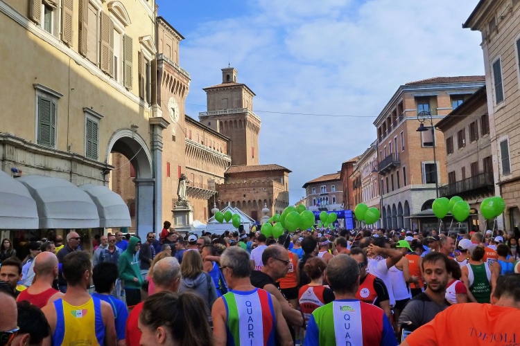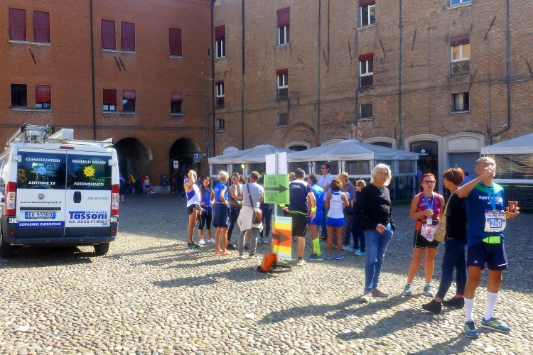 Im Zentrum liegt das Castello Estense, das im 14. und 15. Jahrhundert den Herzögen der Familie Este als Stammsitz diente. Das Schloss ist von einem Wassergraben umgeben. Die Startunterlagen bekommen wir in den Kellergewölben. Das Gesundheitszeugnis konnte schon bei der Anmeldung hochgeladen werden. Läufer aus dem Ausland, die keine Starterlaubnis eines Leichtathletikverbandes vorlegen können, erhalten kostenlos die Runcard, die ein Jahr gilt. Noch ein Tipp: Es gibt ein neues Gesundheitsformular, welches die notwendigen Untersuchungen aufführt und eine Referenz auf das zugrundeliegende Gesetz. Das einfacher gehaltene Formular der großen italienischen Marathons wird nicht überall von den Verantwortlichen des Verbands FIDAL anerkannt.