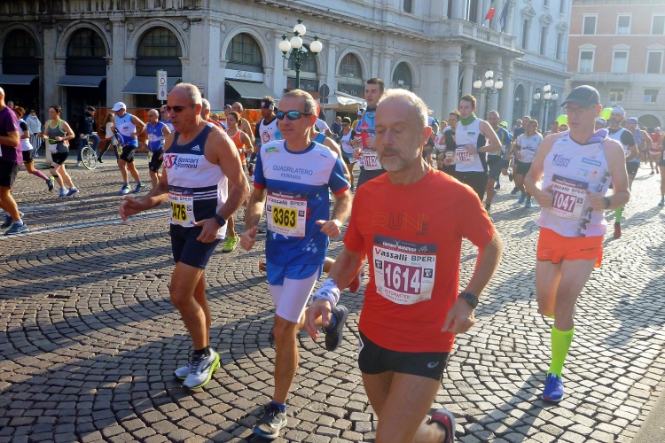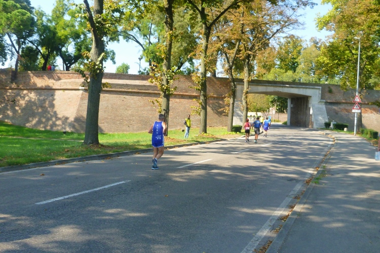 Dann sind wir schon wieder auf einer breiten Straße, Polizisten lotsen uns durch einen Kreisverkehr. Schnurgerade geht es auf der Via Caldirolo dahin. Ich bin so was von fertig. Nicht stehen bleiben, einfach weiter. In der Sonne liegt die gut erhaltene Stadtmauer aus dem 17. Jahrhundert, neun Kilometer ist sie lang. Endlich die Porta Mare, aber es geht daran vorbei. Die Stadt besitzt zwei Tore Richtung Osten. Letzter VP, Cola. Spannende Zweikämpfe kann man hier erleben. Ich überhole mehre Läufer, werde aber auch von unheimlich schnellen Damen deklassiert. Wer weiß, wo Judith jetzt ist?