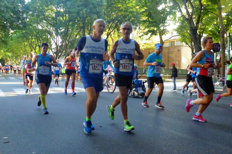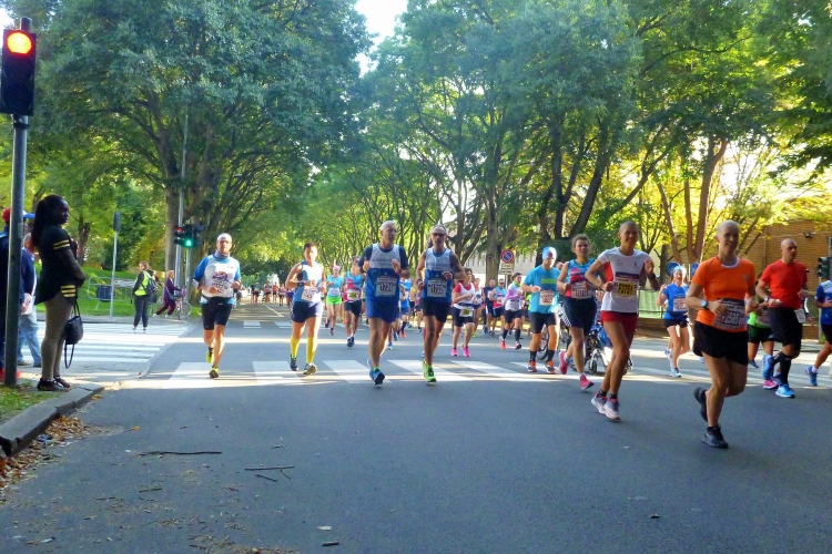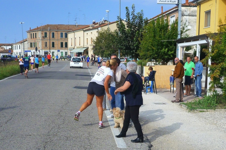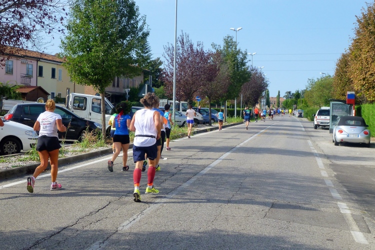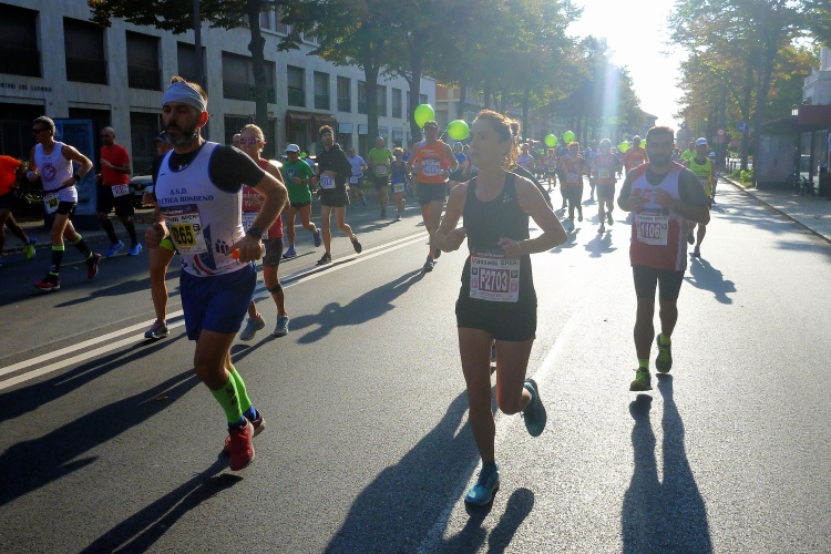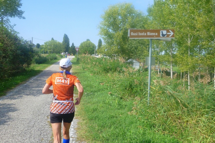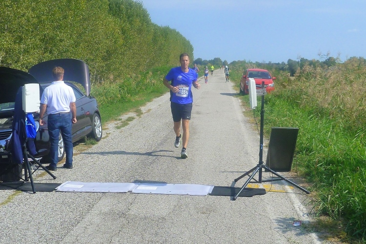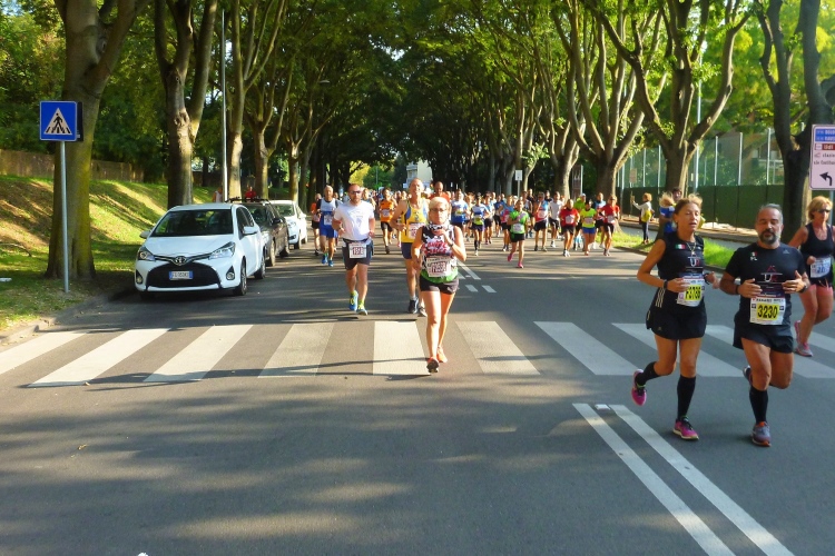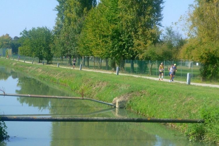 Judith zieht vorbei und ich verschlafe an der Verpflegungsstelle den Anschluss. Es geht in den Stadtpark Giorgio Bassani, benannt nach dem Autor des auch in Deutschland bekannten Ferrara-Romans „Die Gärten der Finzi-Contini“. Der einzige Kilometer auf Schotterwegen und mit einigen Kurven, gut von Flatterbändern markiert. Später werde ich behaupten, dass man, wäre man am Rande des Parks gelaufen, sich einige hundert Meter hätte sparen können. Aber Vorsicht: Es gibt mehrere Zeitmessungen - schön in der Ergebnisliste aufgeführt auch die jeweilige Rangfolge an der Zeitmessung - und zusätzlich einige Kontrollstellen, an denen die Nummern erfasst werden.
