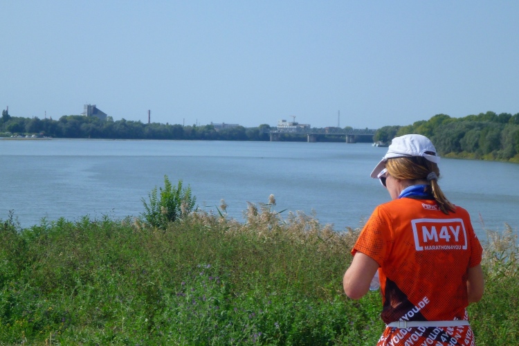 Wahrscheinlich ist mir doch schon zu heiß? Hier oben auf dem Damm zermürbt die Sonne einem das Hirn. Einfach die Ausblicke auf den Strom genießen. Positionskämpfe, eine schon lange abgehängt geglaubte Läuferin aus Hongkong zieht an Judith vorbei. Und es passiert, was ich befürchtet habe: Judith hängt sich dran. Ich beobachte die große Eisenbahnbrücke. Oft fahren Hochgeschwindigkeitszüge vom Typ Freccia Rossa darüber, vorzugsweise dann, wenn ein Baum den Blick verstellt. Die nahe Straßenbrücke ist gesperrt, wahrscheinlich marode. Gibt es ja am Rhein auch, nur dass man hier für die Nutzung der Autobahnbrücke 60 Cent bezahlt.