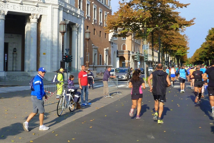 Los geht‘s durch die sehr breite Viale Cavour. Einige monumentale Gebäude sind zu sehen, so das hiesige Postamt. Zuschauer gibt es auch einige. Ein weißhaariger Autofahrer trägt gerade einen hitzigen Disput mit einem Polizisten aus. Eigentlich unnötig, denn bei km 0,5 ist die Strecke doch gleich wieder frei.