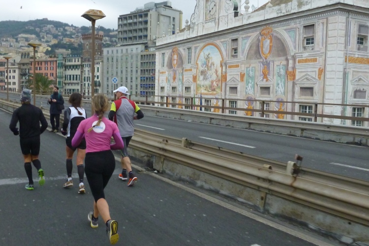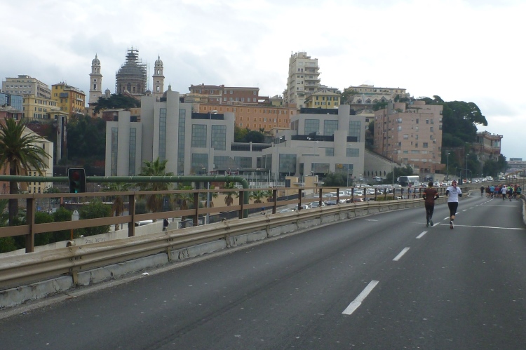 Das nahe Hochhausgebiet, auf einem Hügel gelegen, kündigt das Ende unserer Hochstraße an. Über eine eher flache Brücke geht es auf die rechte Fahrspur und dann weiter Richtung Ponente, also in den Westen. Helfer weisen den Weg. Alternativ käme man hier schnell auf die Autobahn. Wir laufen ins Viertel Sampierdarena. Zwischen Bahndamm und schönen Gebäuden geht es dahin. Ein nettes kleines Sträßchen. Nun kommen auch immer mehr Läufer entgegen.