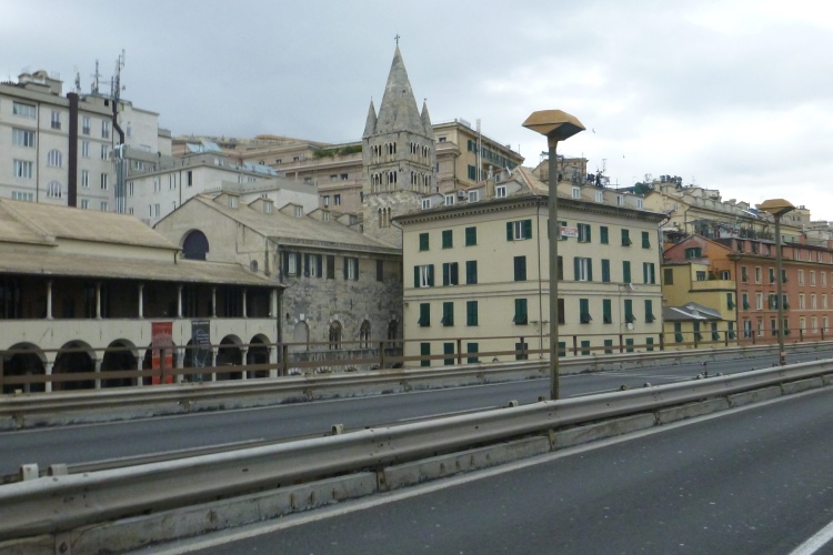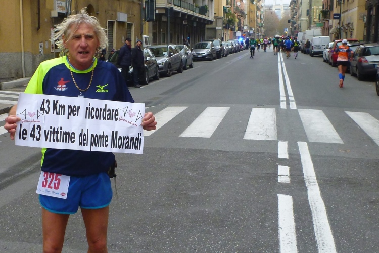Der Genueser Marathoni Roberto Bolognesi kommt mir mit einem Erinnerungsplakat entgegen. Vor uns steht der mittlere Pylon samt Fahrbahn. Nach verdächtigen Geräuschen mussten die direkt unter ihm liegenden Wohnhäuser geräumt werden. Die Konstruktion dieser Schrägseilbrücke von Riccardo Morandi aus dem Jahr 1967 galt schon lange als sanierungsbedürftig. Ebenso wird schon lange an einer neuen Autobahnumfahrung Genuas geplant und mit Bürgerinitiativen, die dagegen sind, diskutiert. Noch im Dezember soll mit dem Abbruch der Brücke begonnen werden. Der Genueser Architekt Renzo Piano wurde mit dem Neubau beauftragt.