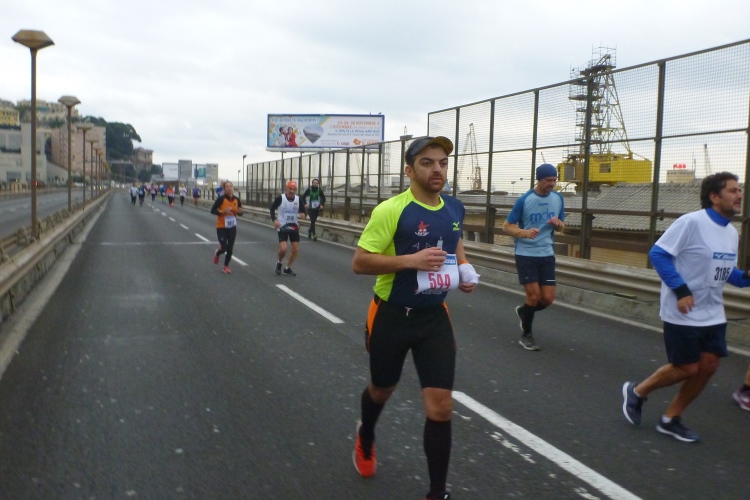 Wieder zurück beim Piazzale Kennedy geht es nun auf die Sopraelevata Aldo Moro. So nennt sich die Hochstraße, die findige Verkehrsplaner am Hafen entlang gebaut haben und die im August 1965 der Nutzung übergeben wurde. Die Hochstraße ermöglicht viele Blicke auf das Hafengebiet. Es geht erst leicht nach oben und dann sanft nach unten. Der Bodenbelag ist spitze, man kann sich ganz dem Rausch der Geschwindigkeit hingeben. Vor mir sehe ich den kompakten Pulk der Vierstundenläufer. An die werde ich mich langsam heranschieben. Am Hafen gibt es eine Abfahrt, wo auch Zuschauer stehen. Die 11-km-Läufer dürfen nun schon nach unten ins nahe Ziel. Für uns geht es weiter.