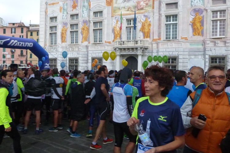 Dann einige hundert Meter zurück Richtung Altstadt. Vor dem Palazzo San Giorgio mit seinen sehenswerten Wandmalereien ist der Startbogen untergebracht. Gut geschützt stehen wir unter der Hochstraße. Tschäntoduätschinkwe (102,5) nennt sich ein sehr bekannter italienischer Radiosender, der hier den Moderator stellt. Der fröhliche Mann macht so seine Späßchen, als der Starttermin um 8:30 Uhr verstreicht. Ich vermute mal, dass es doch 9:00 Uhr werden wird. Minütlich steigert sich die Unruhe und um 8:50 Uhr geht es dann endlich los. 1.000 Marathonis und 400 Teilnehmer/innen des 11 km langen Fantozzi-Laufs (benannt nach einer Comedy-Figur, dargestellt von dem Genueser Schauspieler Paolo Villaggio) rasen los.