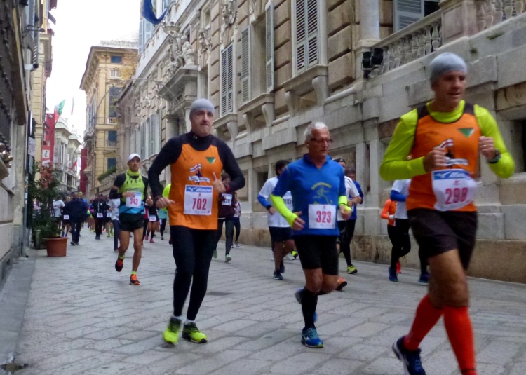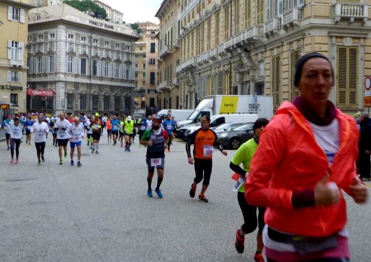Einfach erklären lässt sich die Streckenführung nicht: Irgendwie handelt es sich um einen Auftakt in der Innenstadt mit drei anschließenden Runden auf gleicher Strecke, die jedes Mal kürzer werden. Muss man nicht verstehen, wenn man sich auf die Streckenposten und die Markierung verlassen will. Später stelle ich fest, dass man hier anscheinend den Verlauf des populären Genua-Halbmarathons mit seinen 10.000 Teilnehmern adaptiert hat.
