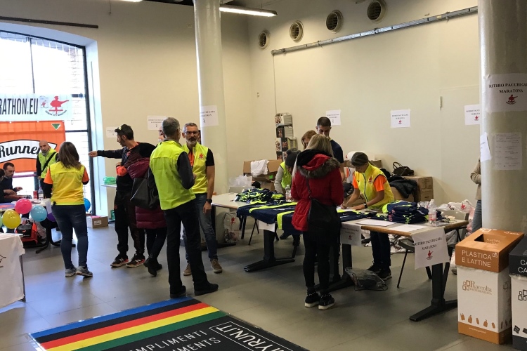Auf den englischsprachigen Seiten des Veranstalters ist der Start auf 9:00 Uhr angesetzt. Uns hatte man gesagt, dass es um 8:30 Uhr losgeht. Kurzum, wir sind rechtzeitig an der Messe, wo zur Aufbewahrung nur die Starterbeutel akzeptiert werden. Da aber viele italienische Läufer/innen wie wir noch Sporttaschen oder Rollkoffer dabei haben, gibt es neben der offiziellen Aufbewahrung eine Ecke, in der man diese abstellen kann. Die wichtigen Dinge haben Judith und ich im Plastiksack abgegeben.