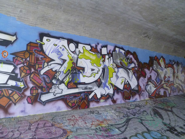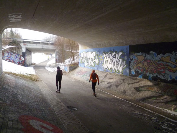 An der nächsten Rheinbrücke (KM 5) verlassen wir den Uferweg. Nach rechts führt uns die Strecke durch Flurlingen in die Höhe. Fast 4 km und 150 Höhenmeter beinhaltet der Aufstieg zum höchsten Punkt des Kurses, wo wir einen herrlichen Überblick über unsere Laufstrecke, die Stadt und die Landschaft haben. Einige Male unterqueren und passieren wir die Autobahn, bevor es wieder runter geht. Die Graffiti-Künstler haben an den Autobahnbrücken gute Arbeit geleistet, diverse Kunstwerke sind zu begutachten.