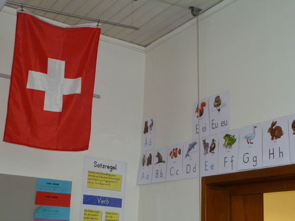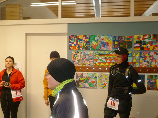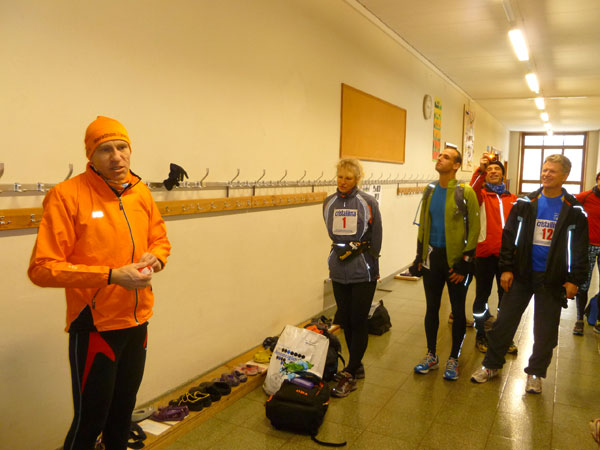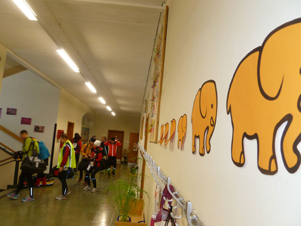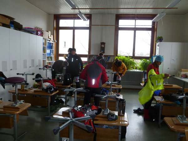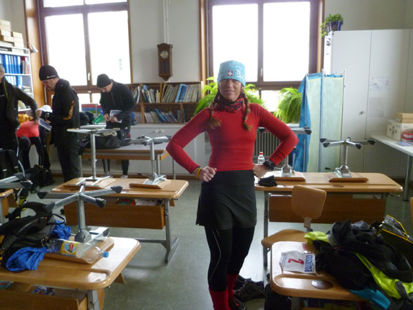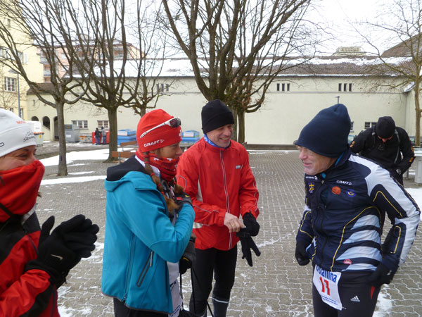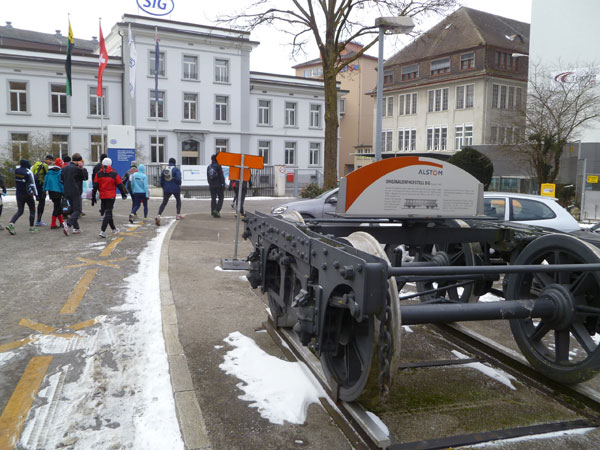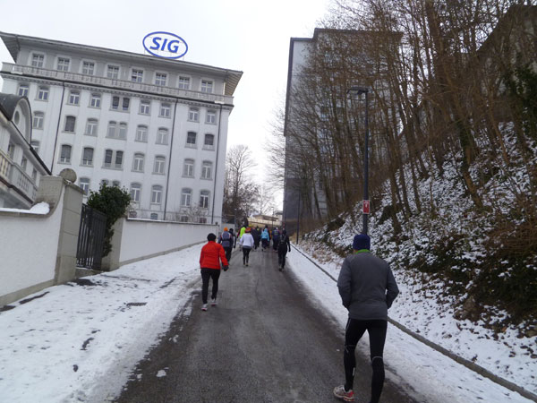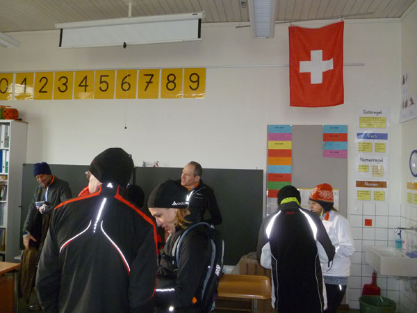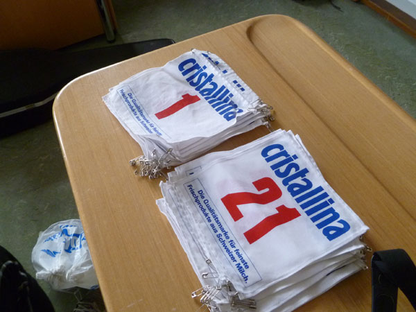 Treffpunkt ist in Neuhausen am Rheinfall im Kanton Schaffhausen/Schweiz vor dem Schulhaus Kirchacker, ca. 20 km von der deutschen Staatsgrenze entfernt. Zugleich ist hier auch Daniel’s Wirkungsstätte im täglichen Arbeitsleben. Den Grundschülern der 1. – 3. Klassen lehrt er das Einmaleins. Eines der Klassenzimmer dient uns kurzfristig als Umkleideraum, dafür wird extra das Schulhaus aufgesperrt. Zum Lauf hat er wunderschöne Retro-Startnummern aus Stoff organisiert von einem mittlerweile aufgelösten Sportverein.