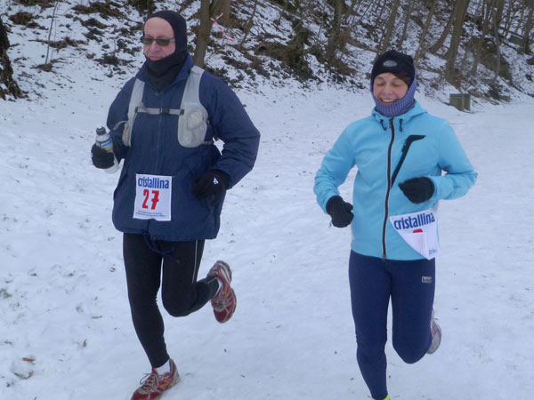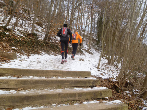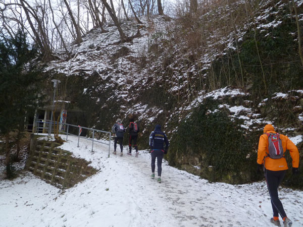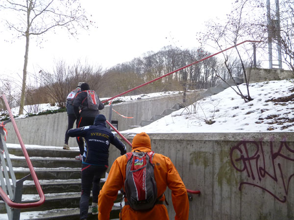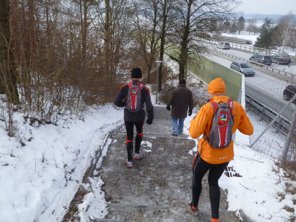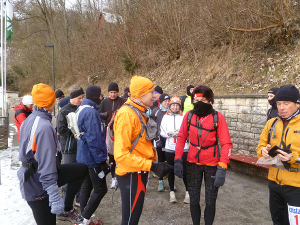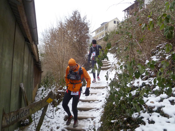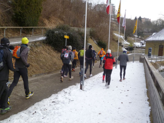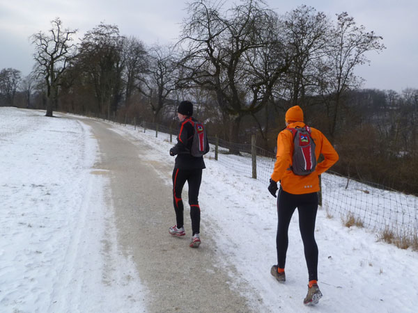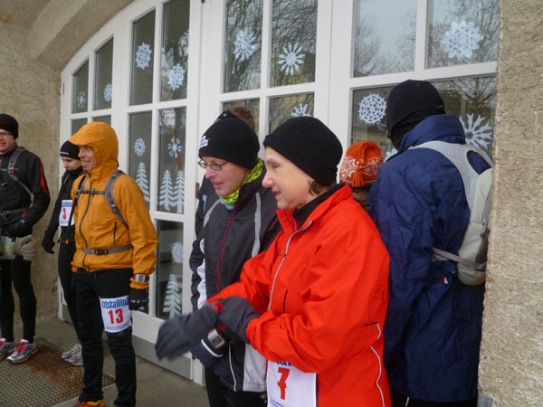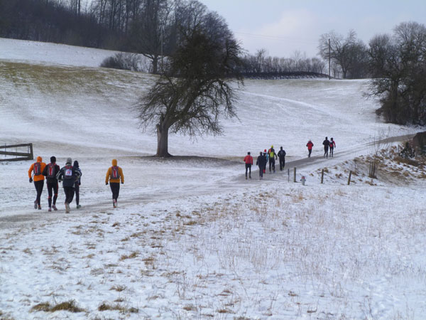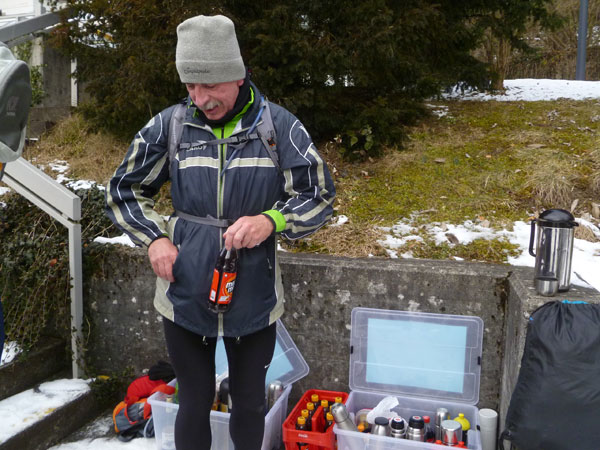 Bei der Start- und Ziellinie werden zwei Boxen deponiert, wo wir Thermoskannen und andere Getränke einlagern können. Ich habe gleich zwei dabei mit heißem Tee und fülle mir eine Trinkflasche mit dem noch dampfenden Gebräu für die erste Runde auf. Mit leichter Verspätung geht’s um 10.15 Uhr los. Ca. 250 Höhenmeter pro Runde sind uns versprochen, macht summa summarum 1.000 für die den ganzen Kurs. Das ist nicht zu unterschätzen. Die ersten davon dürfen wir gleich vom Start weg einlösen, deftig geht’s nach oben.