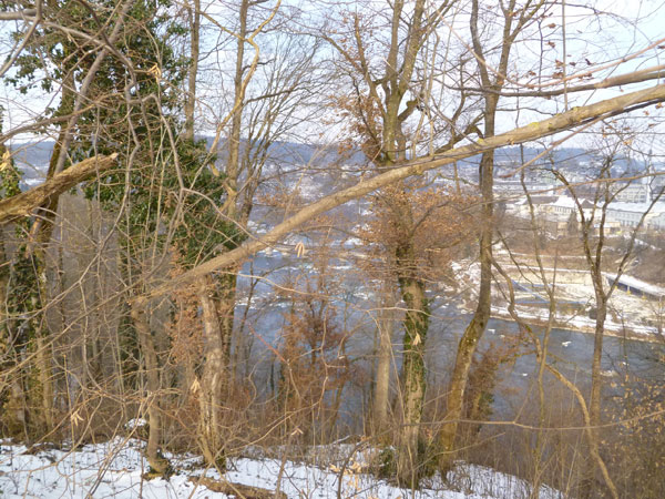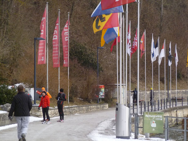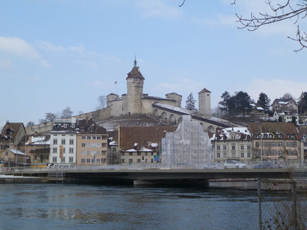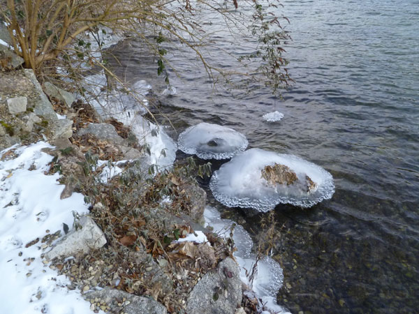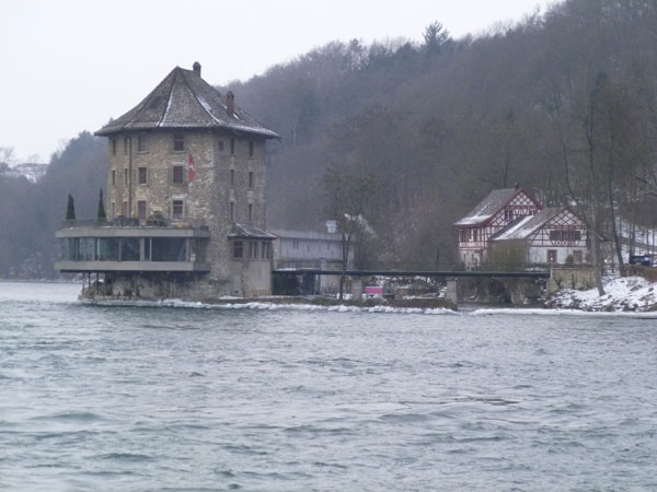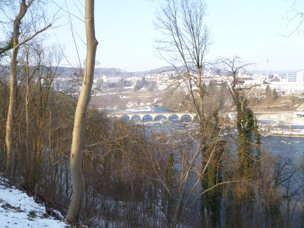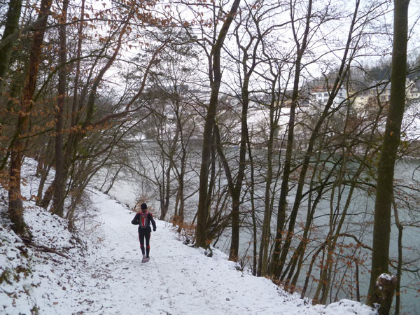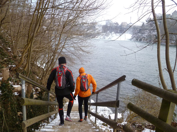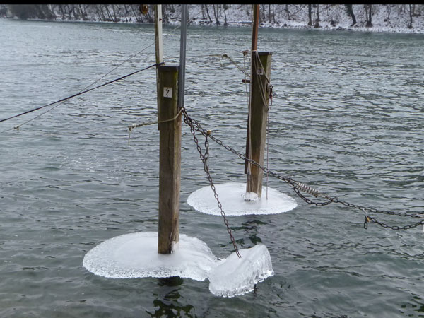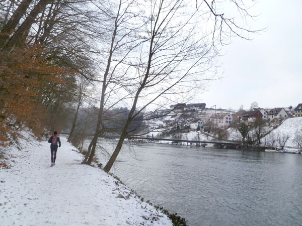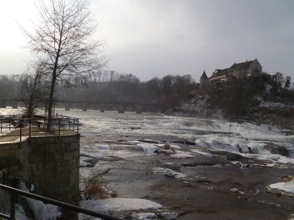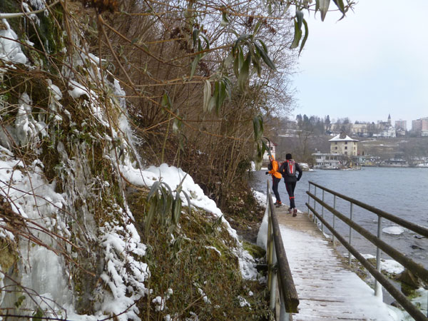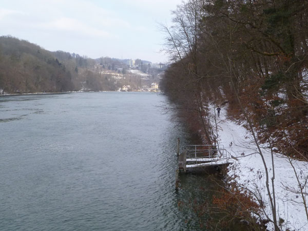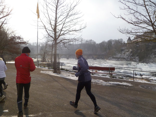Runter geht’s bedeutet schneller. In einem Rutsch werden alle Höhenmeter wieder egalisiert. Zwischen den Bäumen kann man wieder den Rheinfall ausmachen. Am Kassenhaus zur Aussichtsplattform herrscht noch immer gähnende Leere. Über eine Million Besuchern pro Jahr finden sich hier ein und damit ist es eine der touristischen Hauptattraktionen der Schweiz. Vorbei an Schloss Laufen geht’s direkt runter ans Ufer des Rheins. Die nächste Brücke lässt uns wieder die Seite und Laufrichtung wechseln. Der schmale Pfad am Fluss auf Wasserhöhe ist ein Genuss, aber ein Fehltritt würde schon nasse Füße bedeuten, also Vorsicht auf dem Schneeboden. Tolle Eisgebilde haben sich auf dem Wasser an der Uferkante und um Bootsbefestigungen gebildet. Die Eiszeit hat auch schöne Seiten.