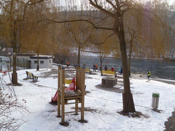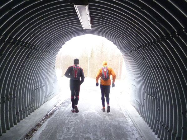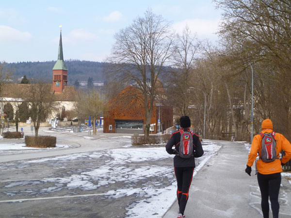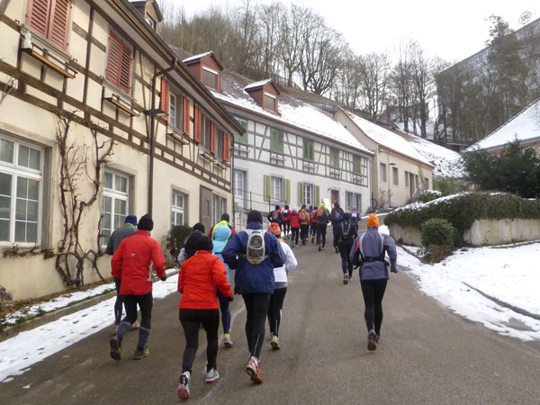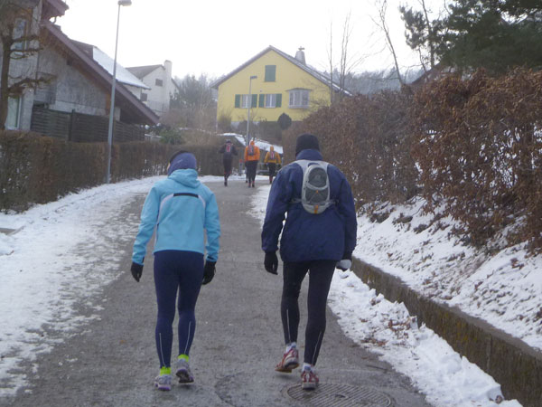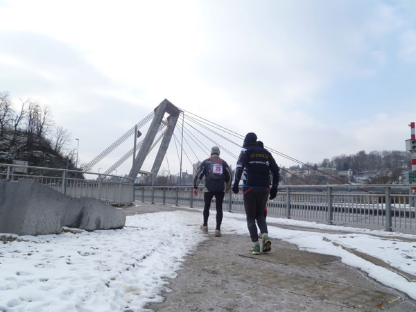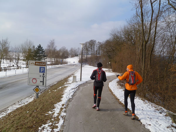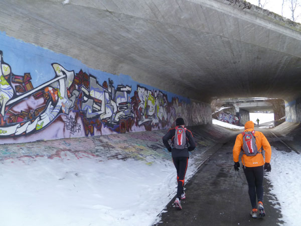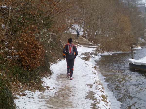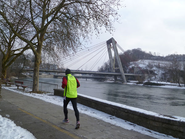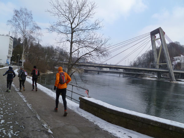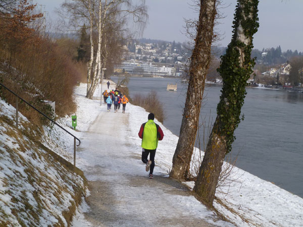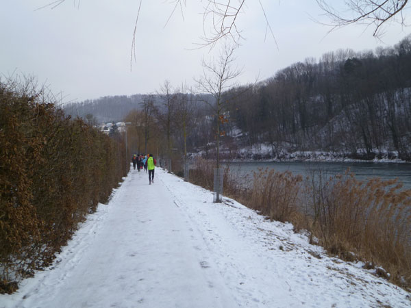 Nach einem guten Kilometer haben wir den Uferweg am Rhein erreicht, genau in östliche Richtung schwenkt unsere Laufrichtung, der Kurswechsel ist wie ein kleiner Schock, sibirisch bläst uns der Wind entgegen. Der Wind-Chill-Faktor verdoppelt zumindest gefühlt die Minusgrade. Gut, dass bei Laufveranstaltungen das Vermummungsverbot nicht gilt. Alles Verfügbare wird über‘s Gesicht gezogen.