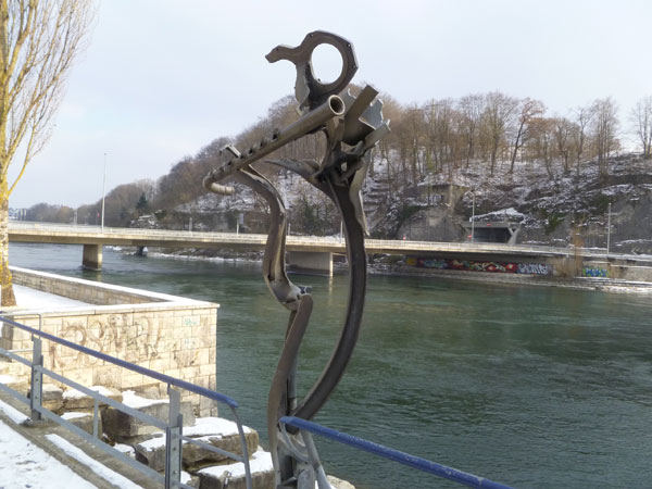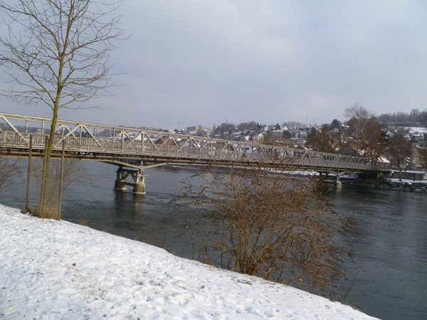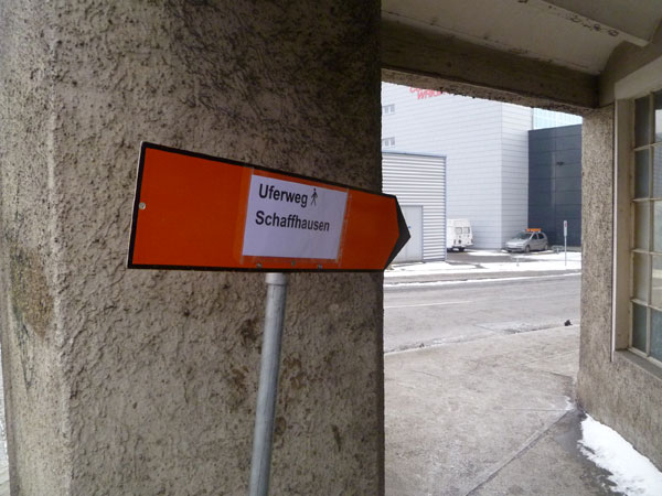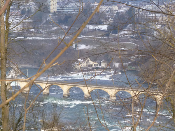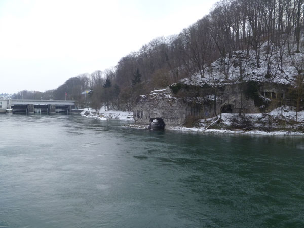 Am Flurlinger Steg gibt es leider eine kleine Kursänderung, der Rheinuferweg wurde wegen dringenden Arbeiten der Kraftwerksbetreiber gesperrt, so müssen wir etwas links davon durch‘s Industriegebiet weiter. An der imposanten Schrägseilbrücke der Autobahn A4 sind in etwa 4 km absolviert und die Stadtgrenze von Schaffhausen erreicht. Wir wechseln auf der direkt daneben liegenden Brücke über. Durch einen Felstunnel erreichen wir den Spazierweg auf der rechten Rheinseite.