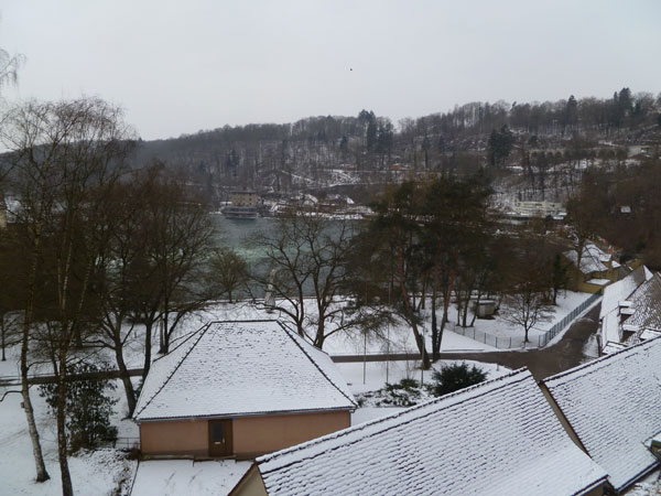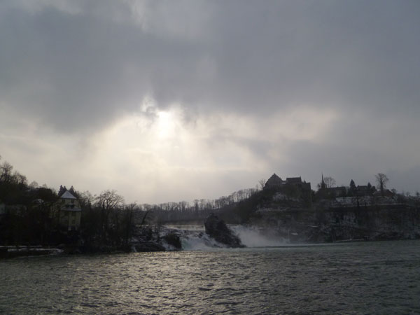 Ein 10-minütiger Fußmarsch führt uns hinunter ans Rheinufer, wo sich wahrscheinlich sonst Heerscharen von Touristen tummeln, um den herrlichem Blick auf das Objekt der Begierde einzufangen. Heute Morgen ist es aber noch ruhig, kein Wunder bei Temperaturen im unteren zweistelligen Minusbereich. Dazu lässt sich die Sonne auch noch betteln und ist nicht präsent. Aber Daniel verspricht: sie wird kommen.