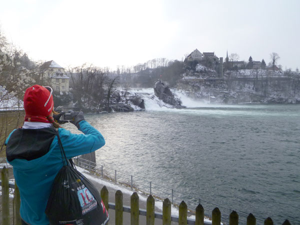 So ein wagemutiges Abenteuer müssen wir natürlich nicht bestreiten. Wir passieren bei unserem Rheinfall Marathon den Wasserfall zwar auch aus nächster Nähe, aber ohne nass zu werden. Wir laufen außen rum auf Landwegen und dazu braucht’s nur etwas Kondition. In vier Runden á 10,6 km bekommen wir ihn aus allen nur denkbaren Positionen auf den Präsentierteller.