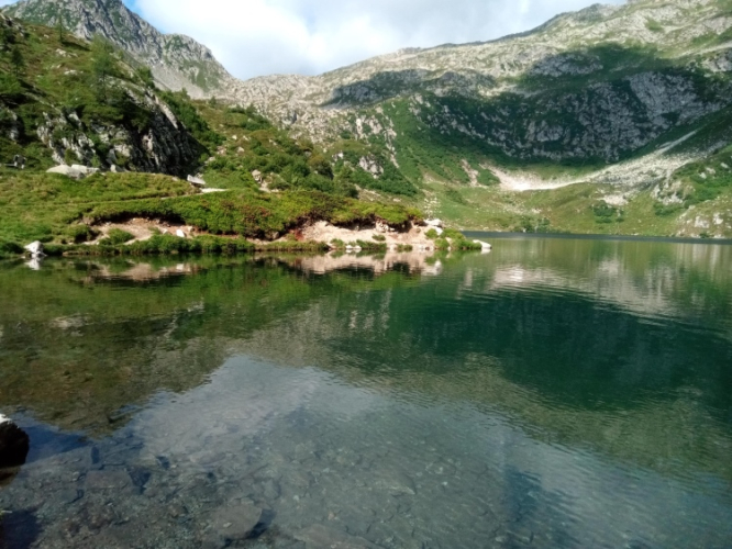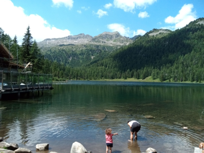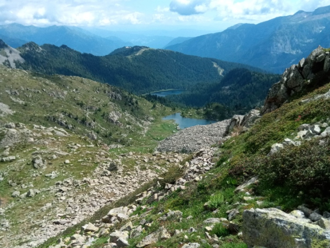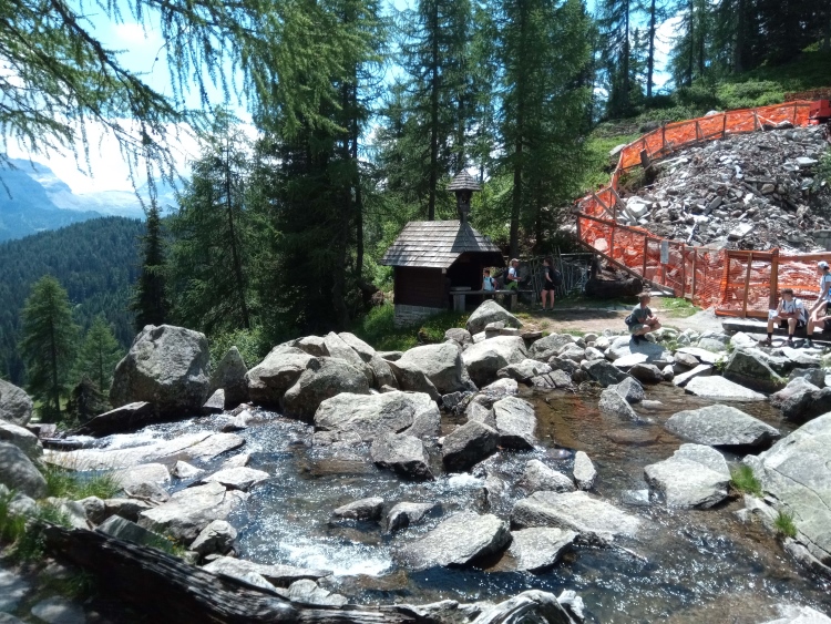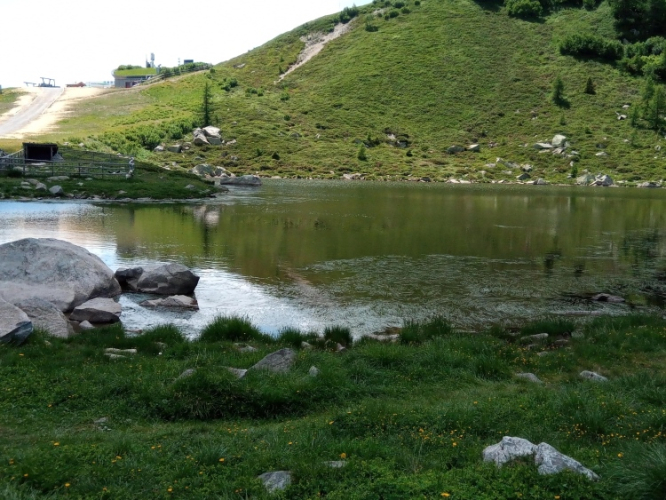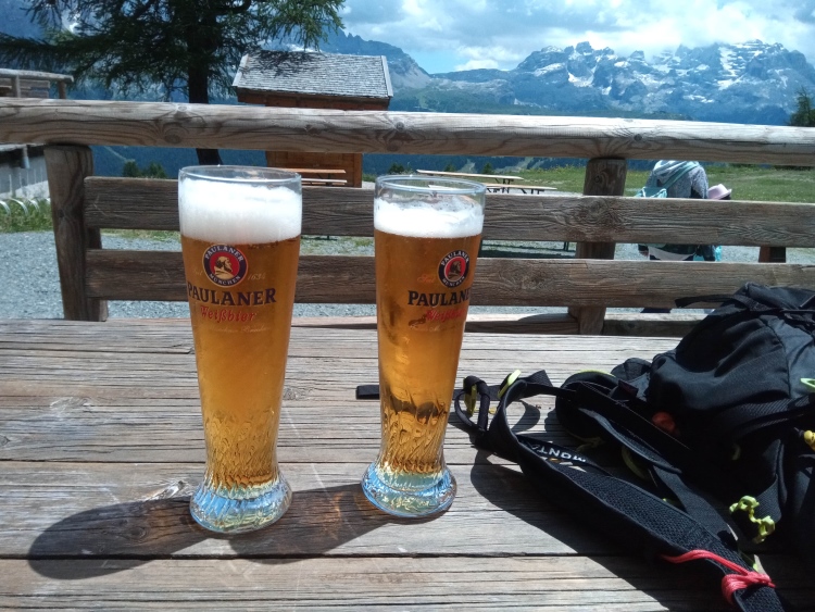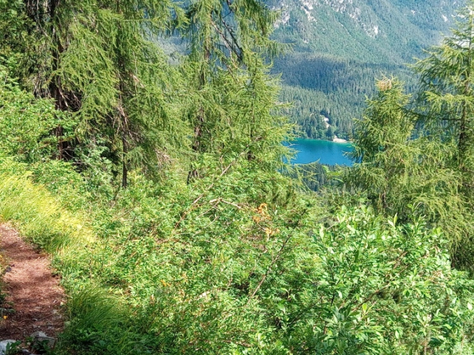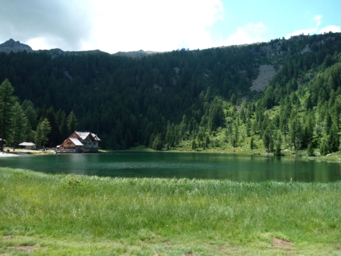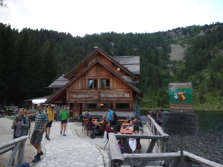 Der Lago Malghette ist anders, der liegt tiefer, kann leicht vom Tal aus erreicht werden und hat eine Hütte. Die wird gerade umgebaut, also wieder kein Hopfentee. Den gibt es aber ein paar km weiter und 300 m höher, ein netter Waldweg, danach Skipiste hoch. Ich bestelle eins und kriege zwei- die Rettung. . Inzwischen bin ich so dehydriert, das versickert einfach so in mir, hebt aber die Stimmung. Auf Skipiste, dann durch Wald laufe ich zum letzten See, dem Lago Nambino, mit Hütte, weiter. Alternativ kann man oben am Hang bleiben und hat tolle Aussicht auf den See.