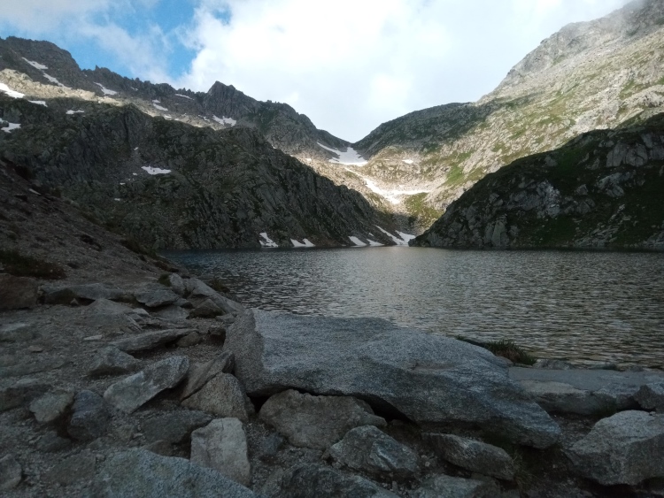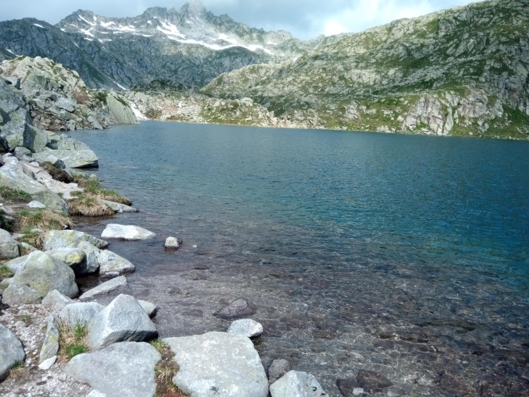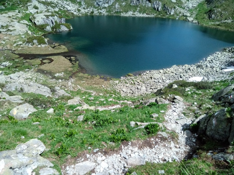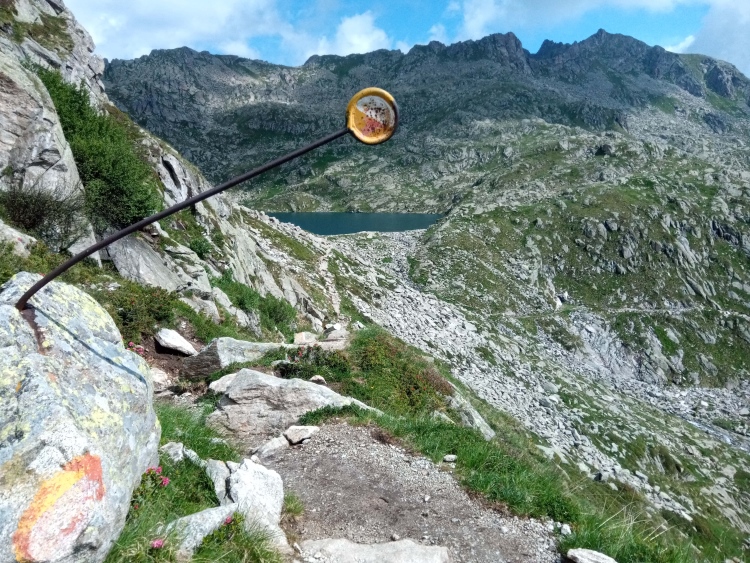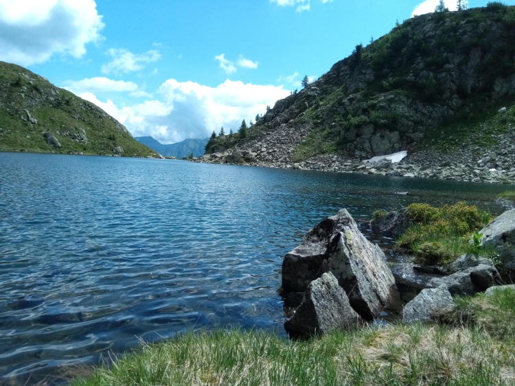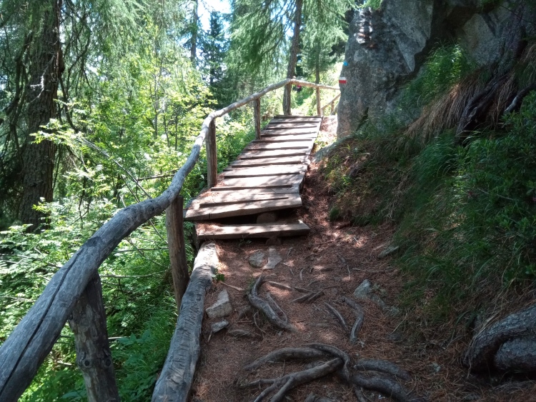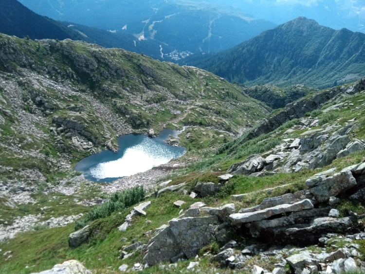 Der Lago Malghette ist anders, der liegt tiefer, kann leicht vom Tal aus erreicht werden und hat eine Hütte. Die wird gerade umgebaut, also wieder kein Hopfentee. Den gibt es aber ein paar km weiter und 300 m höher, ein netter Waldweg, danach Skipiste hoch. Ich bestelle eins und kriege zwei- die Rettung. . Inzwischen bin ich so dehydriert, das versickert einfach so in mir, hebt aber die Stimmung. Auf Skipiste, dann durch Wald laufe ich zum letzten See, dem Lago Nambino, mit Hütte, weiter. Alternativ kann man oben am Hang bleiben und hat tolle Aussicht auf den See.