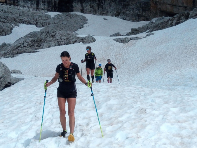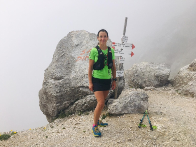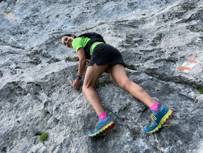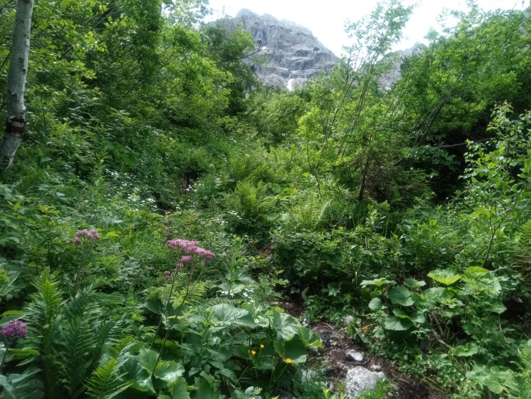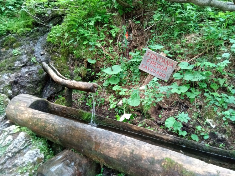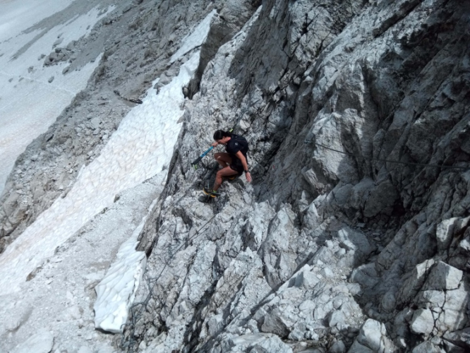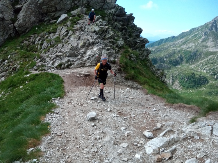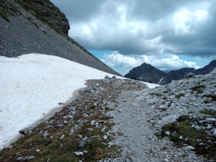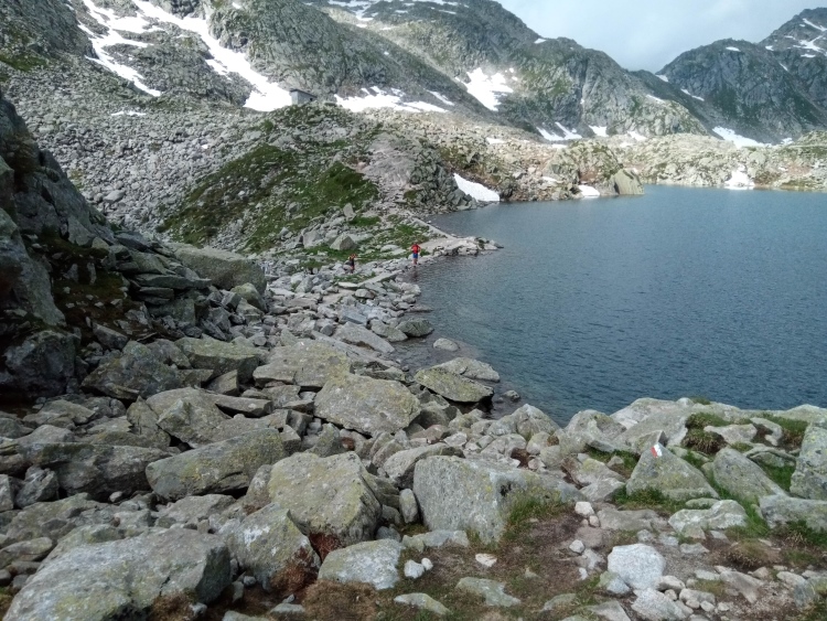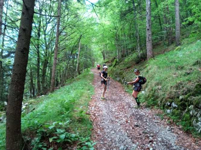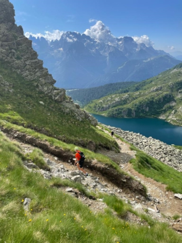 Ab der Vallesinella- Hütte wähle ich für mich den Bärentrail, einen stillen, gut laufbaren Pfad durchs Bärengebiet. Und hier ist die einzige echte Quelle an diesem Tag: auf so 70 m neben dem Weg quillt Wasser aus den Felsen, lecker! Bisher war da nämlich gar nichts! Also: alles mitnehmen, wie beim UTMB. Genug zu trinken und die ganze Hochalpin- Ausrüstung!