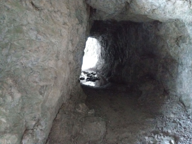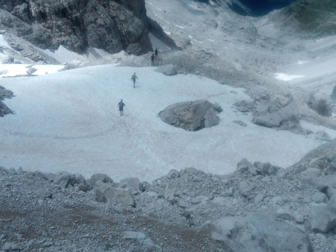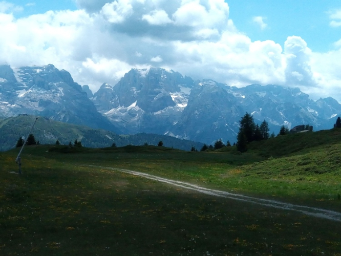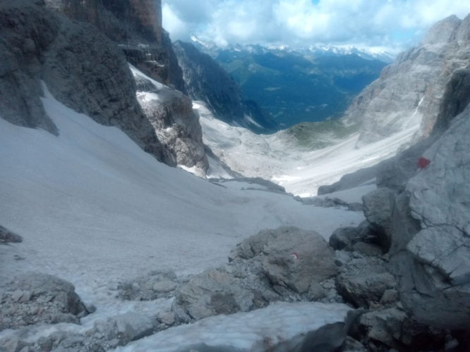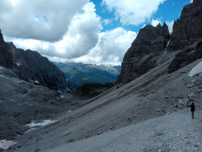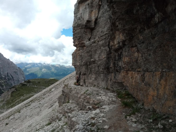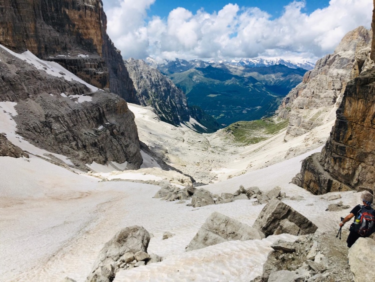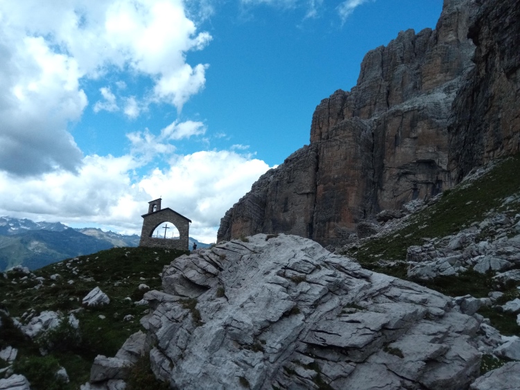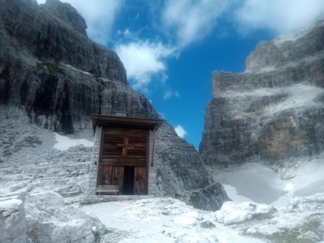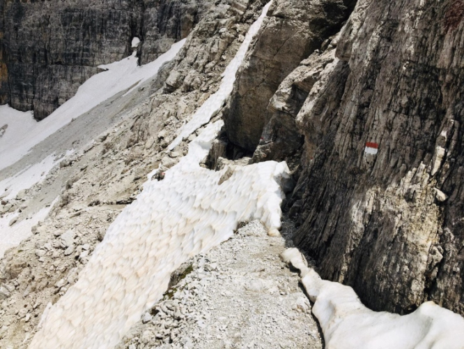 Und schon geht es munter weiter, an der Alpini-Kapelle vorbei, noch mal 60 m höher über eine Scharte. Bloß nicht auf den Schnee, meinte der Hüttenwirt. Am Rand bleiben. Wegmarkierungen sind kaum zu sehen, etwas tiefer testen wir mal den Schnee – und siehe da, es geht, alles läuft, mit enormem Tempo, was für ein Spaß! Erst an einer Abbruchkante bremsen wir, dort ist etwas zu klettern, dann weiter im Schnee bis der gut erkennbare Weg auftaucht. Leicht abwärts fallend, auf festem Weg, manchmal über Schotter, führt er uns auf das Ziel zu. Die nächste Hütte wird umgebaut, also kein Hopfentee. An einer Gabelung orientieren und weiter. Senkrechte Wände rechts, weite Täler links, vor uns, noch ganz weit weg, Madonna! Hier ist auch so knapp die Hälfte geschafft.