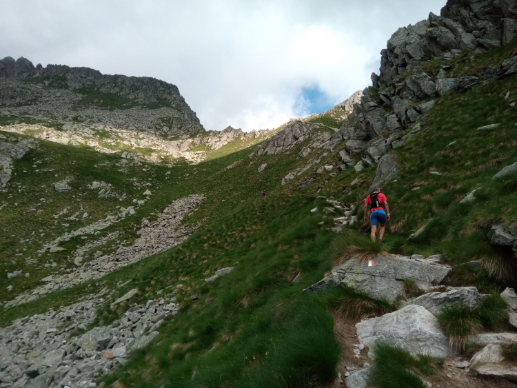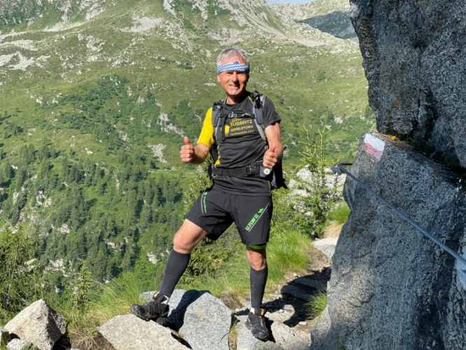 Schönes Wetter, die Gipfel sind noch von Nebelfetzen verdeckt. Auf einem Parkplatz treffen wir uns, 9 Läufer, Michael der Organisator und Volker als Begleiter. Unser Gepäck wird verladen, Michael transportiert es zu den Unterkünften. Uhrenvergleich – und ab geht’s. Auf den nächsten 8,8 km wollen 1770 hm bewältigt werden, das ist irgendwie viel. Wie viel, wird uns unterwegs klargemacht. Das ist aber auch der größte Brocken. Heute.