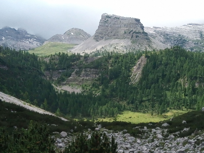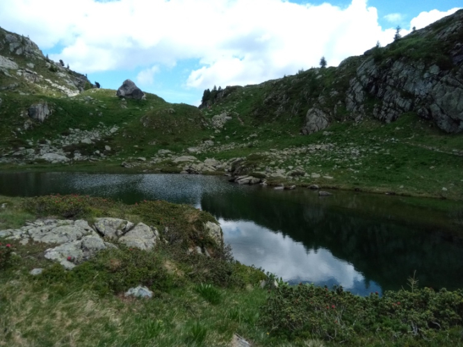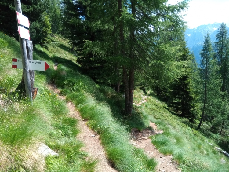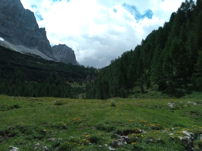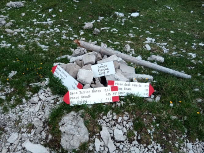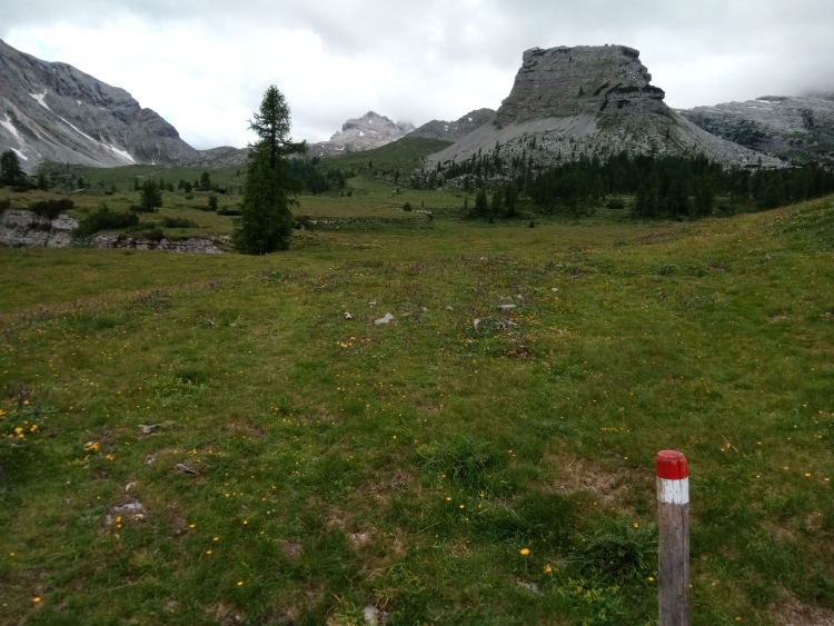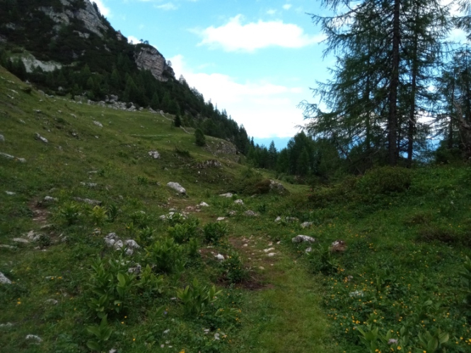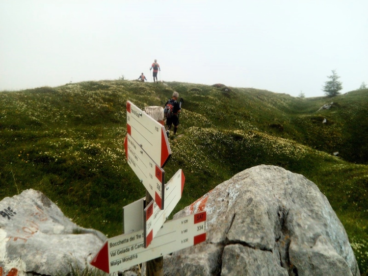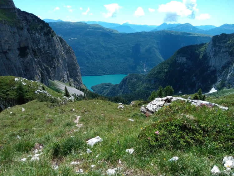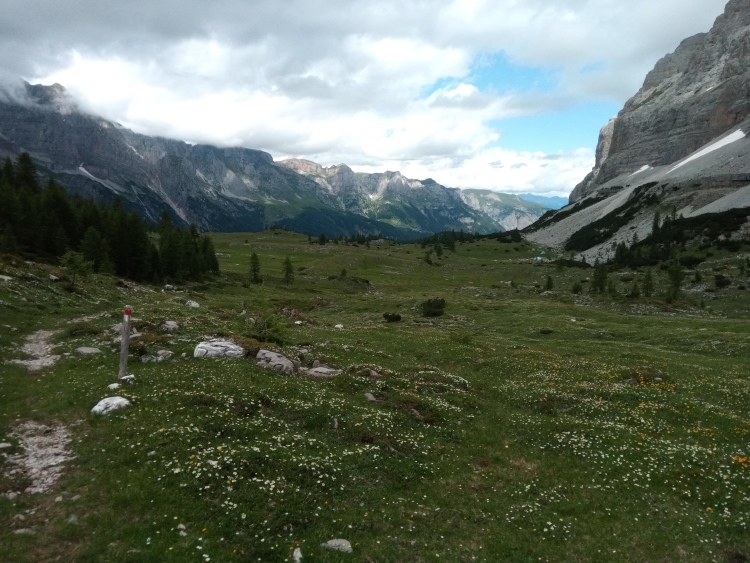 Absolutes highlight (neben dem See) ist ein Hochtal. Vor und hinter Malga Flavona, einer bewirtschafteten Alm, ein einmalig schönes, offenes Tal. Gras und Blumen, eingerahmt von den Schotterhängen, umgeben von markanten Felsformationen. Was für ein Eindruck! Man wird soo klein…und muss trotzdem über den nächsten Pass, 2242m. Dann 300 m runter zur nächsten Alm, der Malga Spora. Noch knappe 10 km zum Ziel, und drei Wege zur Auswahl.