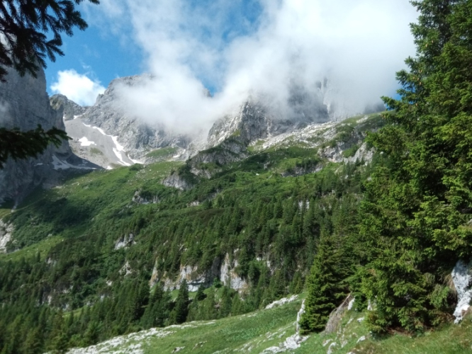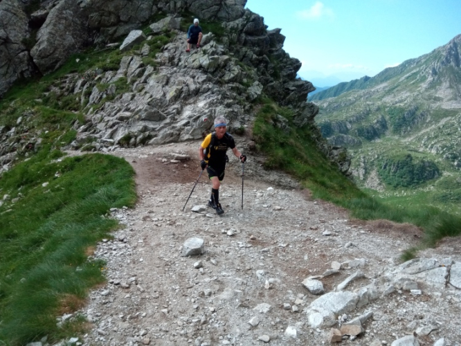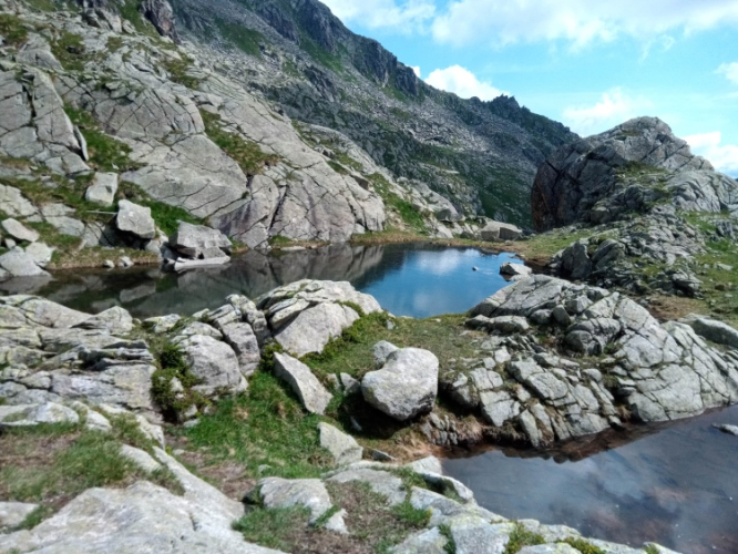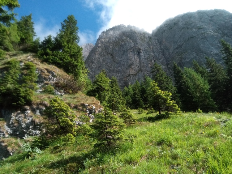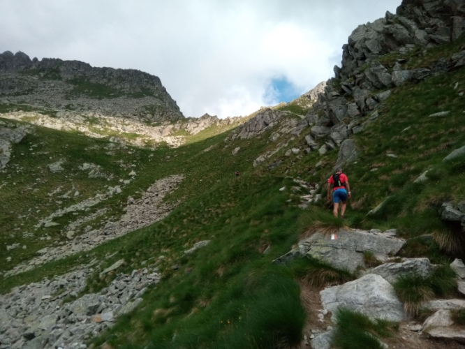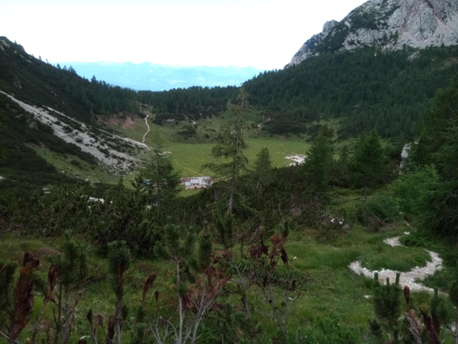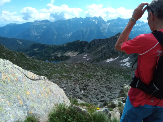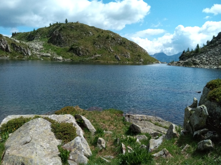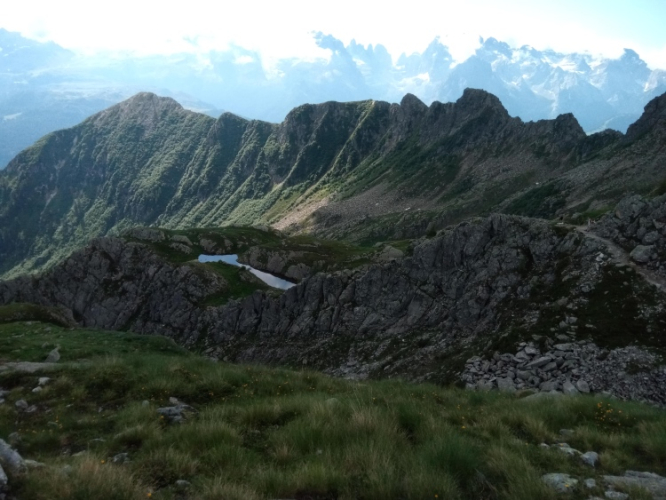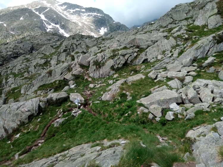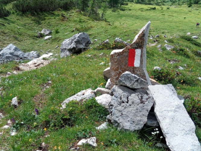 Absolutes highlight (neben dem See) ist ein Hochtal. Vor und hinter Malga Flavona, einer bewirtschafteten Alm, ein einmalig schönes, offenes Tal. Gras und Blumen, eingerahmt von den Schotterhängen, umgeben von markanten Felsformationen. Was für ein Eindruck! Man wird soo klein…und muss trotzdem über den nächsten Pass, 2242m. Dann 300 m runter zur nächsten Alm, der Malga Spora. Noch knappe 10 km zum Ziel, und drei Wege zur Auswahl.