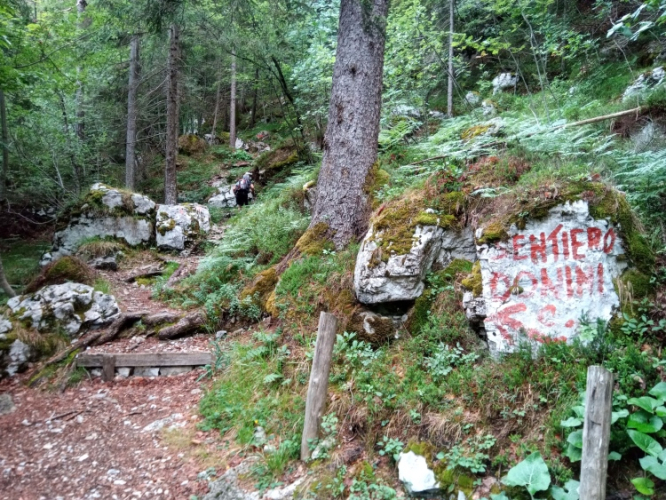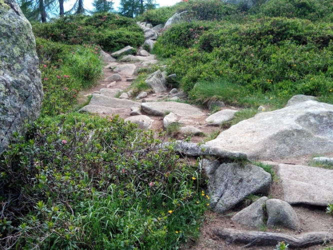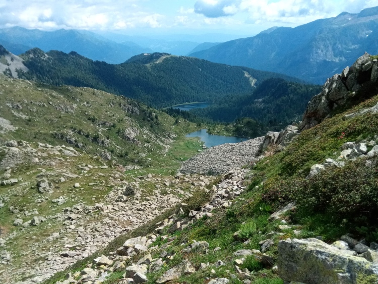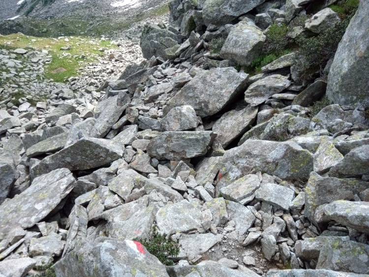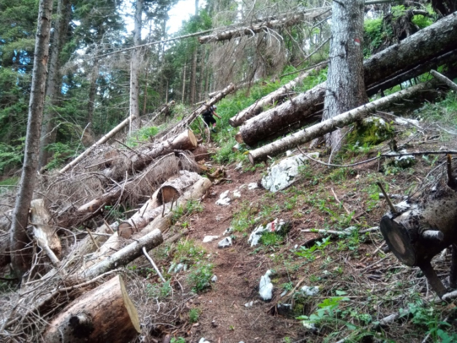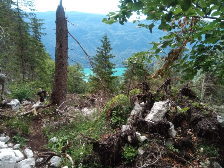Heute stehen die Seen auf dem Programm. Davon gibt es richtig viele, auf der anderen Talseite von Madonna. Westlich also. Die ersten 10 km schlängeln sich so 780 hm allmählich auf Höhe. Zum Warmwerden ganz gut. Man kann aber auch eine Seilbahn nutzen, die alles auf 2 km kürzt und sämtliche hm einspart. Das hat den Vorteil, dass alle Kräfte noch vorhanden sind, wenn es drauf ankommt: die nächsten 10 km haben es in sich! 530 m hoch und 690 runter, aber immer wieder auf total verblockten Trails. Hier ist Erosion am Werk! Bergstürze, Muren, alles quer über den Weg. Lose Steine, alles wackelt, ist schief, Markierungen kaum zu sehen. Wehe bei Nebel oder Regen! Verlaufen ist garantiert!