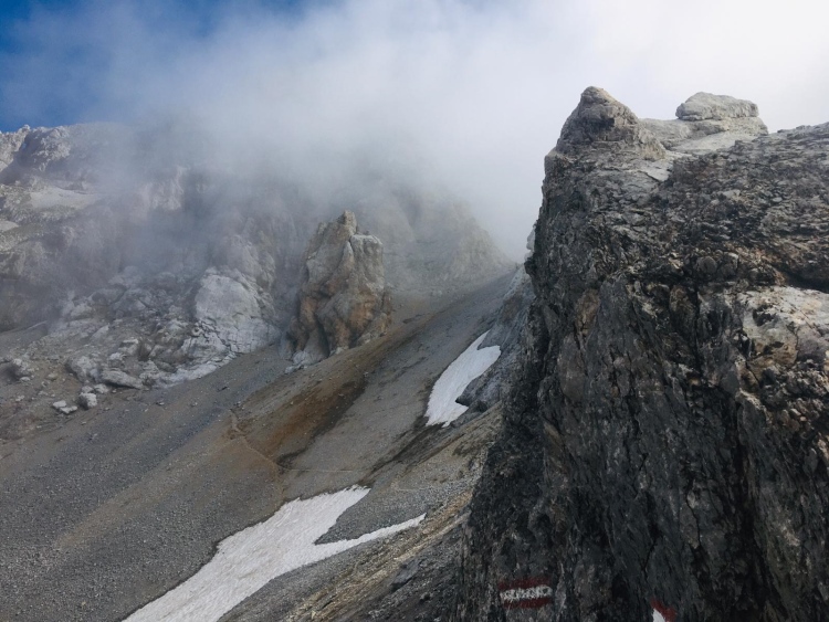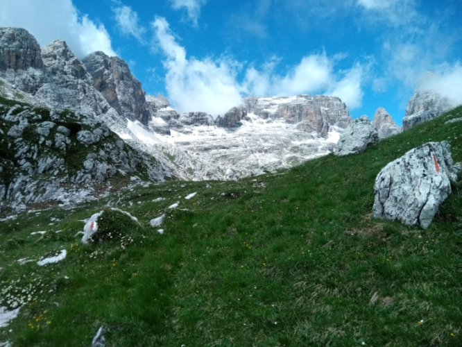 Ab und an, wenn man sich umdreht, eröffnet sich eine phantastische Aussicht: der Lago di Molveno, einer der schönsten Bergseen, liegt da unten. Dreht man sich wieder zurück, sieht man die nächsten 700 hm vor sich… und die power schwindet dahin. Alle sind außer Sicht, aber nicht ganz! Ab und zu erspähe ich was Buntes weit oben. Oder einen Wegepfeil, eingeritzt oder aus Steinen angelegt. Manfred meint es wirklich gut mit mir, er hat ein Auge auf mich. Schon ziemlich weit oben gibt es auch Schneefelder zu queren – und dann, eine Hütte! Rifugio Pedrotti/Tosa. Nach 4 Stunden- oder 5? Ich weiß es nicht. Schwere Unterhopfung vernebelt meine Wahrnehmung. Aber im Rifugio lässt sich das korrigieren…