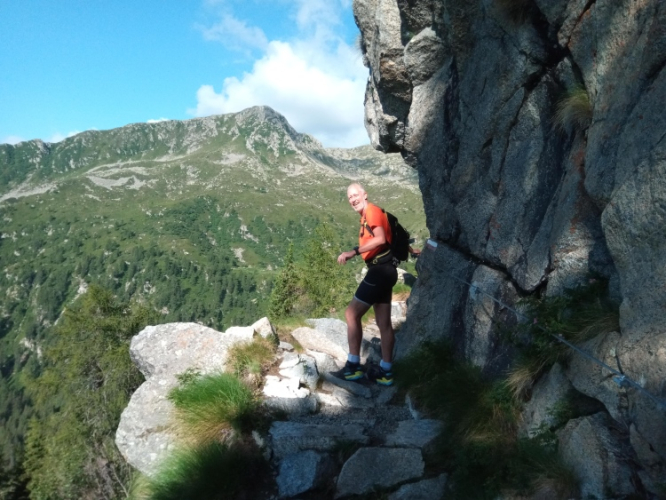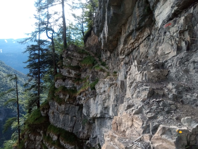 Der Aufstieg beginnt, man muss Zähne zeigen, bereits nach 600 m. Ein Sentiero, mit verblassten Markierungen steigt im Wald auf. Stufen, Wurzeln, Steine. Und immer nur hoch. Ja gut, es gibt flache Stellen, so an der Steilwand längs, mit Seilsicherung. Oder im Wald weiter oben. Ist aber nicht viel, dann kommt schon der nächste brutale Anstieg. Wenig begangen wird der Trail, die Spuren, die ich erkenne, sind von unserer Gruppe. Ohne gutes GPX geht es nicht. Aber das trailbook ( sollte man sich ausdrucken) hilft sehr gut.