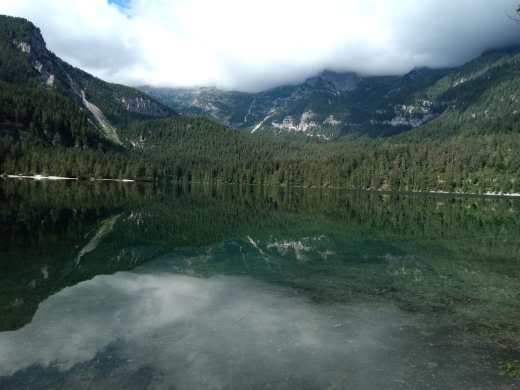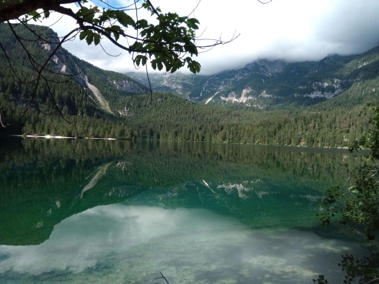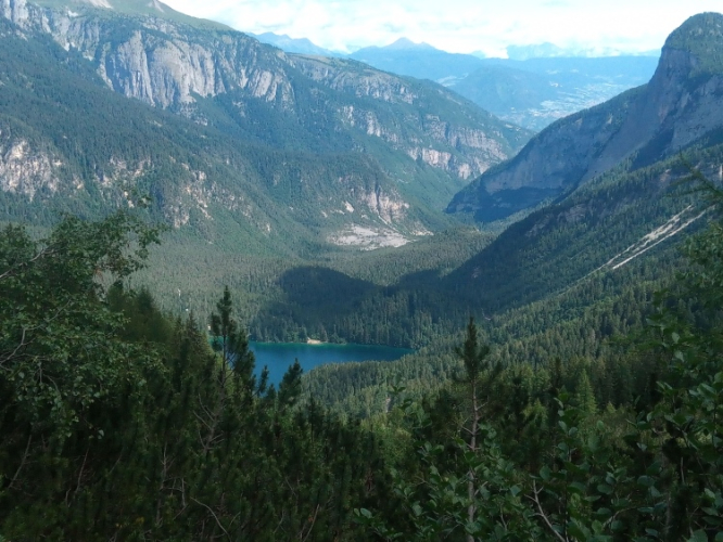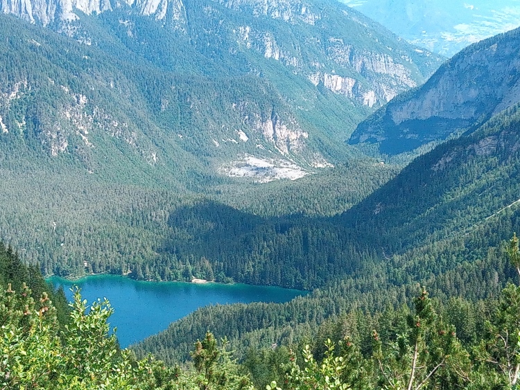Regen ist angesagt für die Nacht und den Morgen. Einige starten deshalb bereits um 6 in der Früh, denn etwa 14 Stunden kann der Weg schon dauern. Aber das Glück ist uns hold – kein Regen! Tiefe Wolken am Pass, der höchste Punkt des Trailabenteuers – Bocchetta dei Tre Sassi auf 2614 m. Das sind gut 1100 m im Anstieg. Hinter dem Pass geht es auch steil wieder runter, Sicherungen und Leitern gibt es da, und eine schwere Entscheidung: 7 km abkürzen und so zeitig ankommen oder lieber doch zum allerschönsten See …? Das ist der Lago di Tovel. Früher hieß der Lago Rosso, weil er sich im Sommer oft rot gefärbt hatte. Das tut er aber nicht mehr. Ein Kleinod ist das. Häuser wie in Kanada, smaragdblaugrünes Wasser, dichter, gesunder Wald. Da muss man hin! Da Volker mit dem Tourmobil auch hinwill, fahre ich mit. Riesenumweg durch die Täler, überteuerter Parkplatz und noch 150 m Aufstieg zum Seeufer sind der Preis dafür. Anders kommt man aber nicht hin, außer eben zu Fuß über die Pässe. Mein Einstieg ist etwa bei km 14, es bleiben noch reichlich hm übrig…