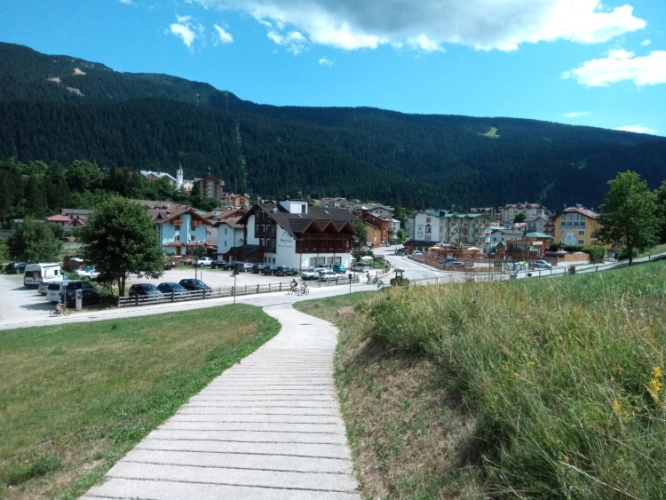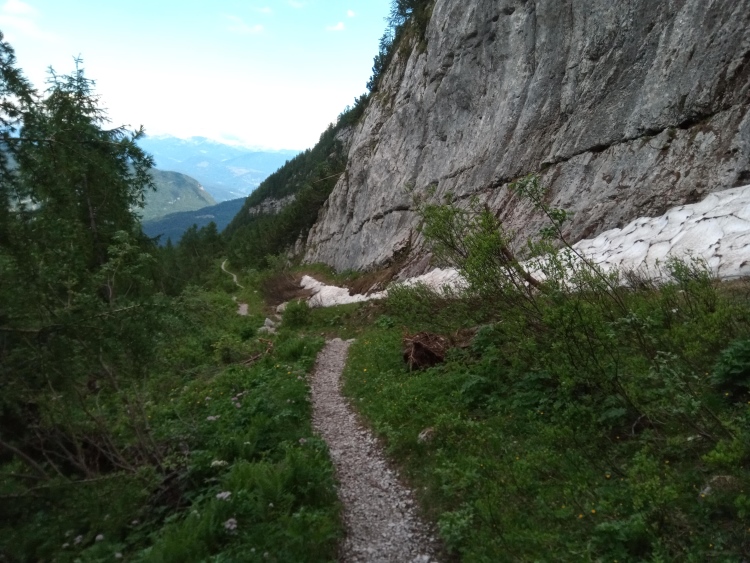 Der Schietwetterweg, 11 km abwärts über Andalo. Der harte über den Passo del Clamer (2164m) und der schöne über den Passo Dagnola (2135m). Alle benutzen den schönen und traben nach dem Pass angenehm flowig zum Ziel. Ich wieder nicht, der Schietwetterweg sagt mir mehr zu. Und der ist auch toll, eine Quelle, Schnee, Steilwände rechts und bodenloser Abgrund links. Spitze. Naja, später kommt ein steiniger und steiler Abstieg, dann der Ort Andalo, und ein Radweg bis Molveno.