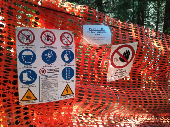Die letzten 5 km geht es sanft bergab nach Madonna zurück. Aber auch hier haben Muren den Weg fast zerstört. Erst sind es Baggerarbeiten, dann die Steine. Und Absperrungen. Molto pericoloso! Nur von unten rauf, wer von oben kommt, wird total überrascht und muss zusehen, wie er über den Zaun kommt…