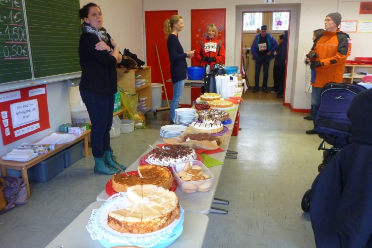 Ich treffe an der Grundschule in Marienhagen viele bekannte Gesichter. Wir holen uns die Startunterlagen und gehen sodann unverzüglich in den Nebenraum. Hier ist die Cafeteria mit dem Kuchenbuffet. Wir haben noch Zeit. Dieter genießt in vollen Zügen 2 Stücke Kuchen. Mann, wie kann der mit dem Bienenstich in der Wampe in einer Stunde denn laufen? Denke ich und belasse es bei einem Kaffee.