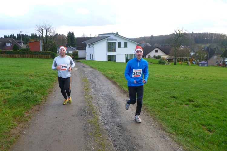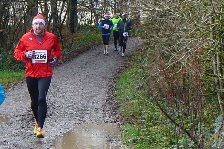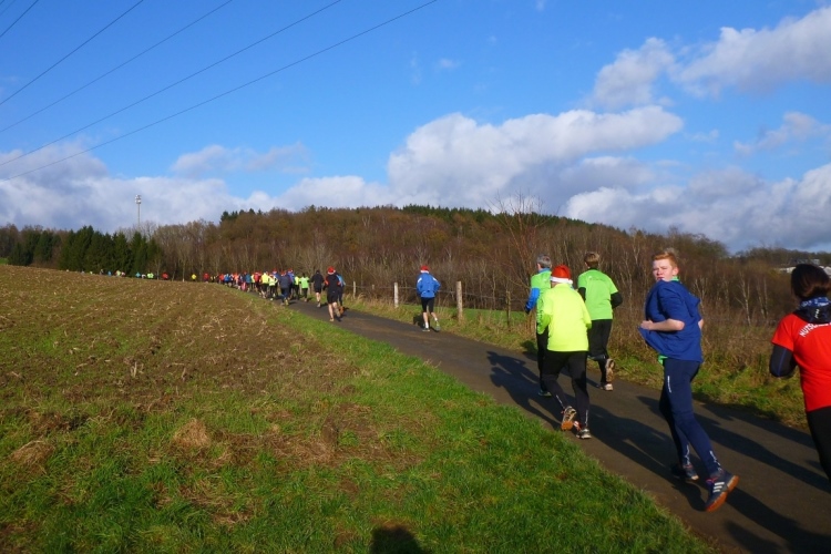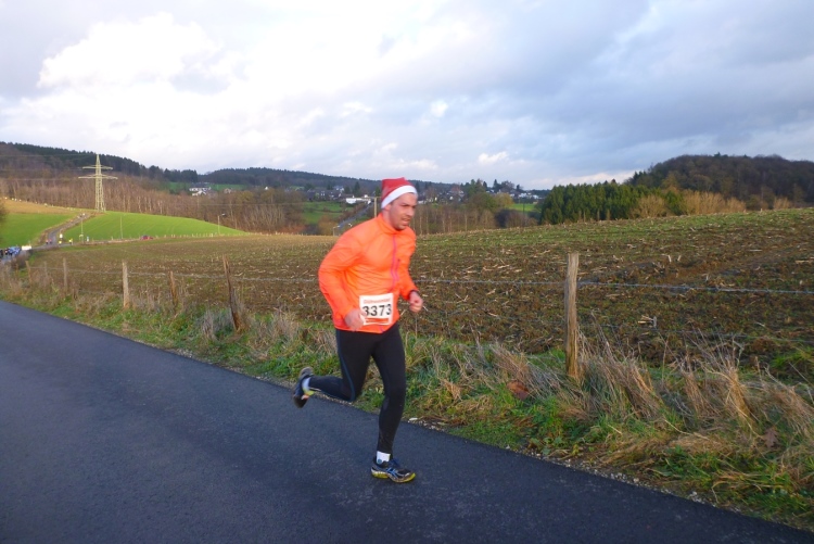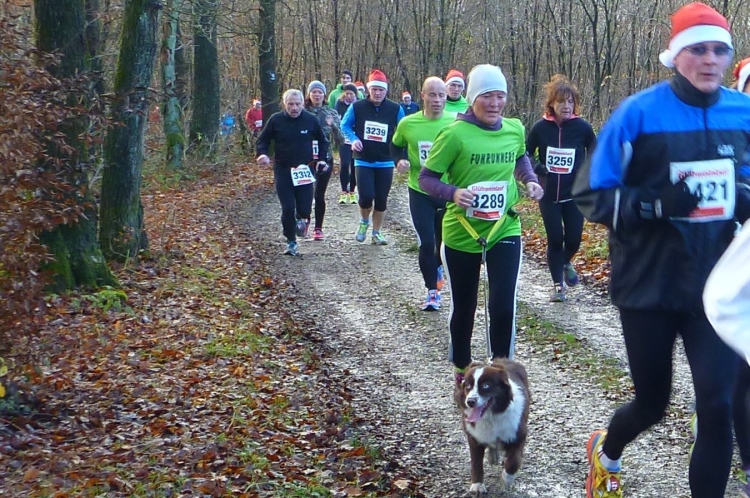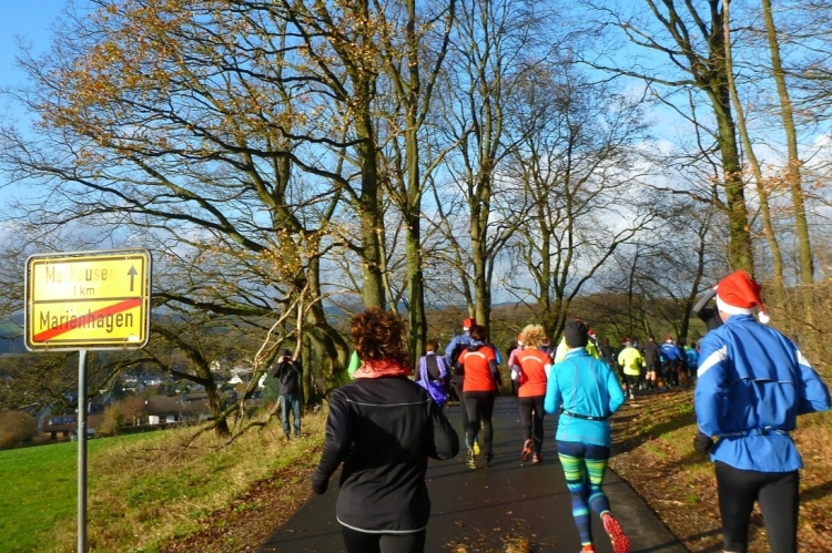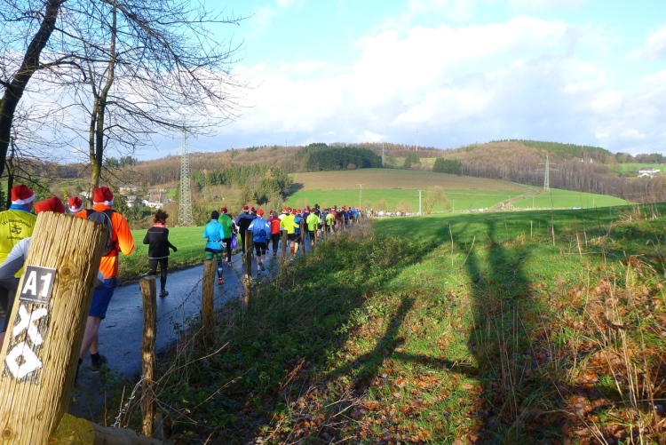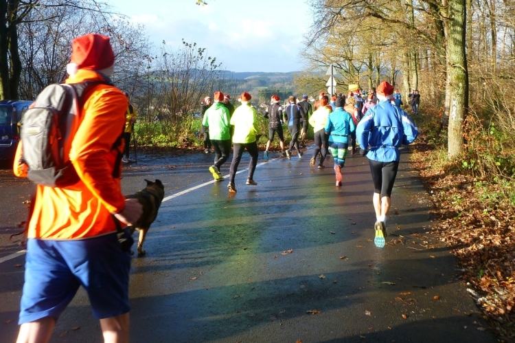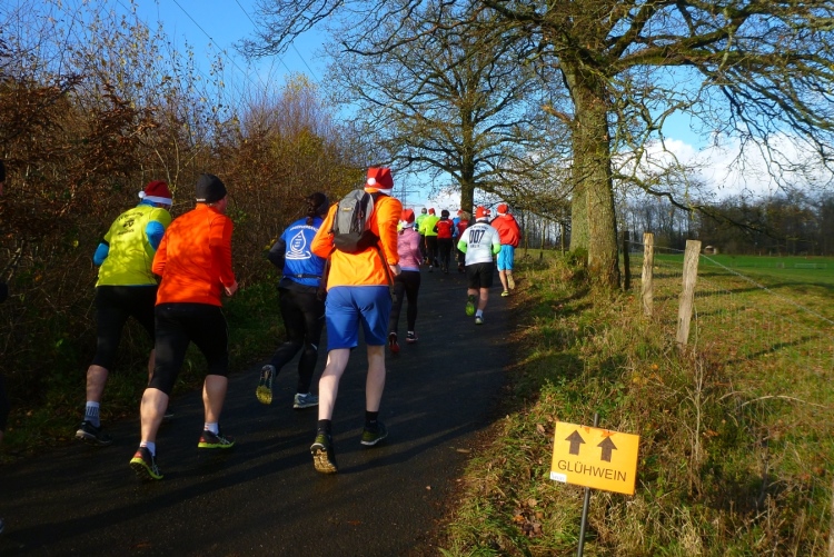 liegen vor uns als Punkt 14 Uhr der Startschuss fällt. Über 200 Läufer nehmen den Glühweinlauf in Angriff. Marcel stürmt vorne los, Dieter haut mir ab, ich trabe gemütlich los. Links sehe ich einen Läufer mit einem stattlichen Schäferhund laufen. Es geht erst einmal steil bergab bis zur Merkausener Straße. Diese überqueren wir gut gesichert von Streckenposten und nehmen gleich die erste happige Steigung in Angriff.