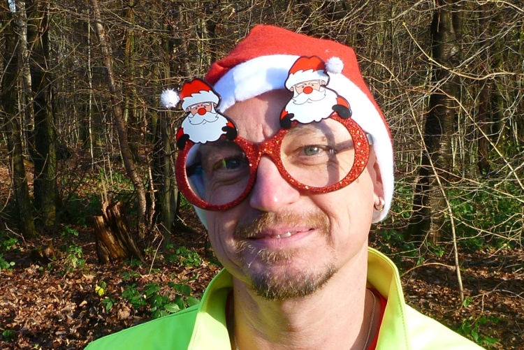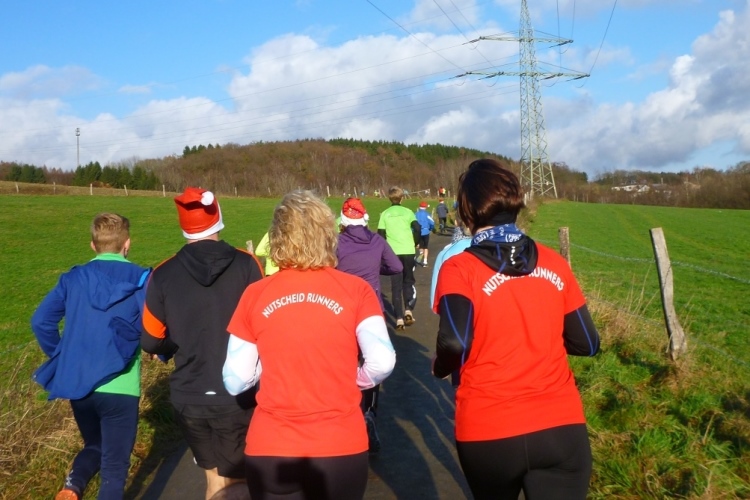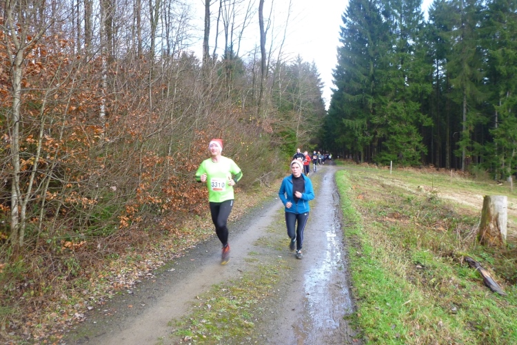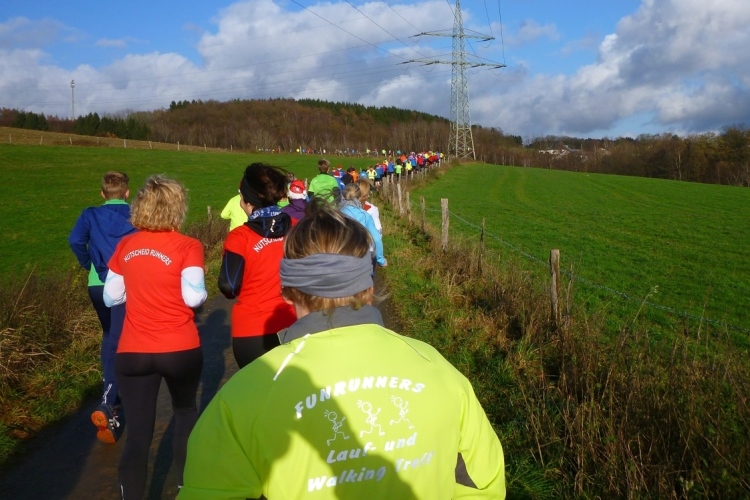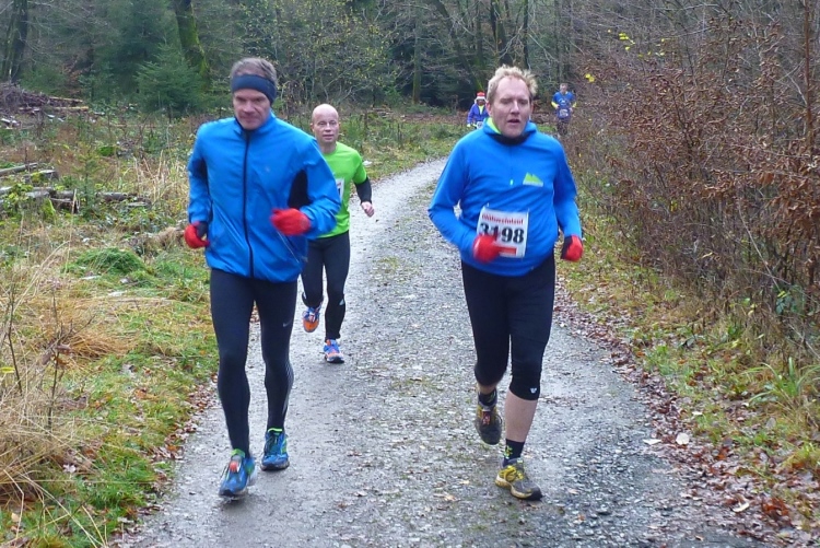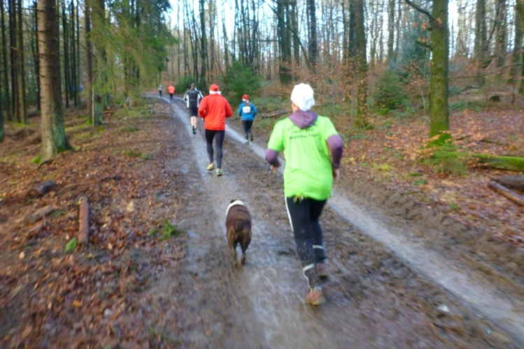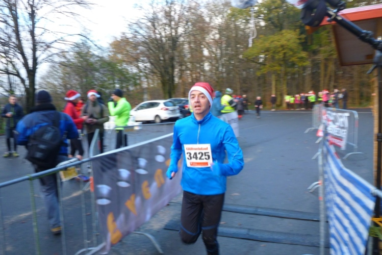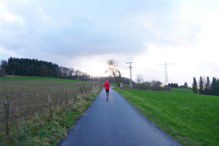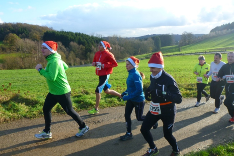 liegen vor uns als Punkt 14 Uhr der Startschuss fällt. Über 200 Läufer nehmen den Glühweinlauf in Angriff. Marcel stürmt vorne los, Dieter haut mir ab, ich trabe gemütlich los. Links sehe ich einen Läufer mit einem stattlichen Schäferhund laufen. Es geht erst einmal steil bergab bis zur Merkausener Straße. Diese überqueren wir gut gesichert von Streckenposten und nehmen gleich die erste happige Steigung in Angriff.