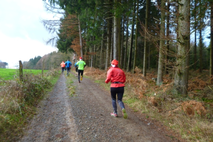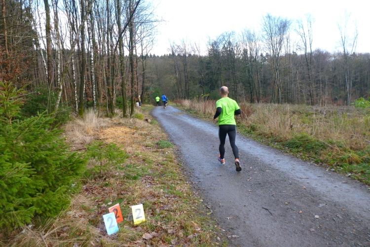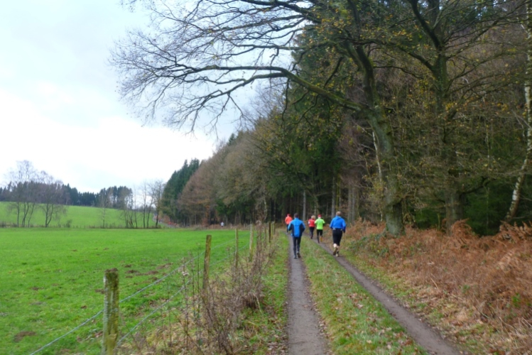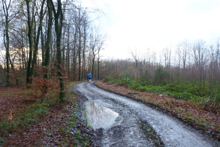 Wir bleiben im Wald. Trotz des Regens der vergangenen Tage und des Vormittags ist das Geläuf gut zu bewältigen. Die Pfützen und Schlammpassagen halten sich in Grenzen. Dazu bleibt es trocken und ohne Wind. Ein Läufer spricht mich an. Was machst denn Du hier hinten? Er hatte mich weiter vorne vermutet. Ob er mich verwechselt mit einem schnellen Läufer? So ganz langsam bin ich mittlerweile aber nicht mehr unterwegs. An jeder Km-Markierung sehe ich, dass ich trotz Fotostopps und Steigungen unter 6 min/km unterwegs bin. Das reicht. Schließlich will ich Ende April beim Madeira Island Ultra Trail über 115 Km mit 6.800 Hm fit sein und nicht hier und heute Höchstleistung abrufen.