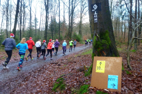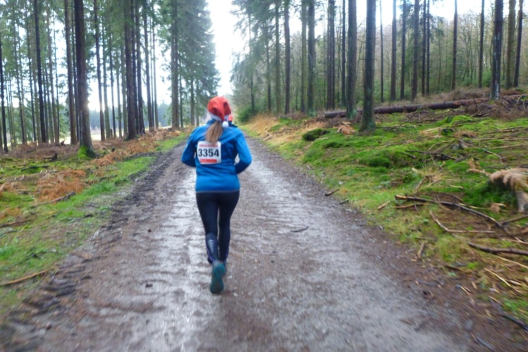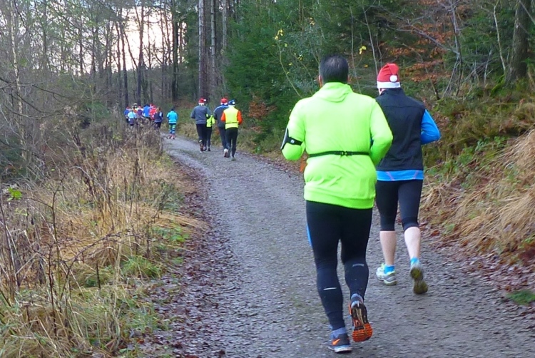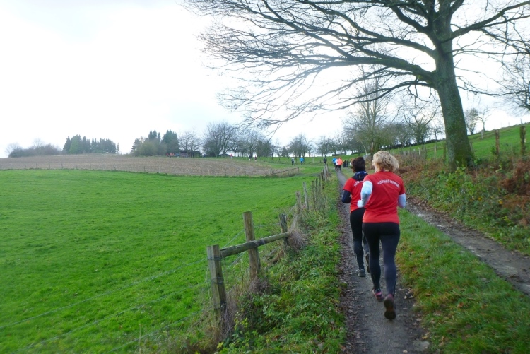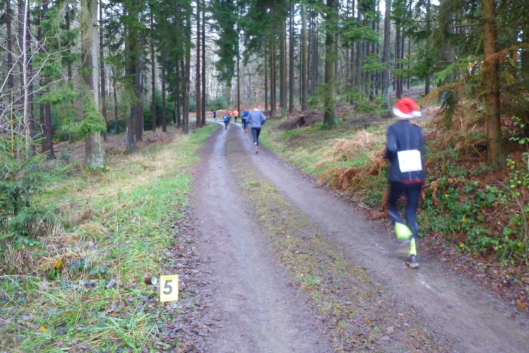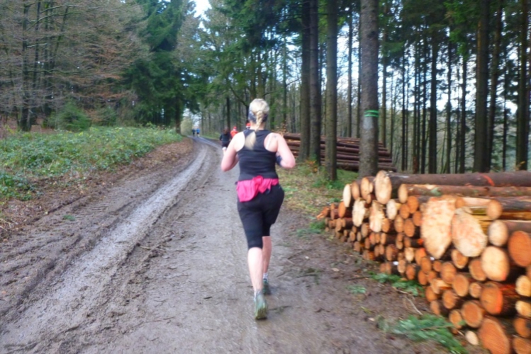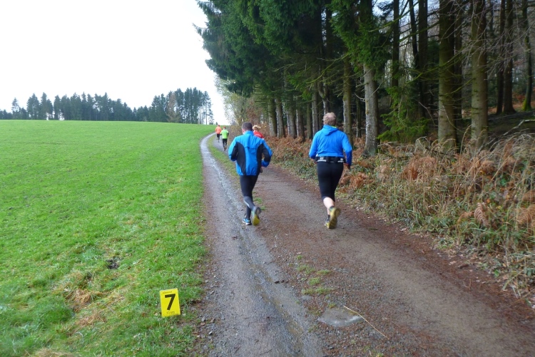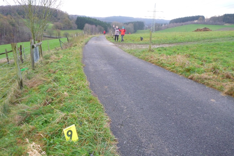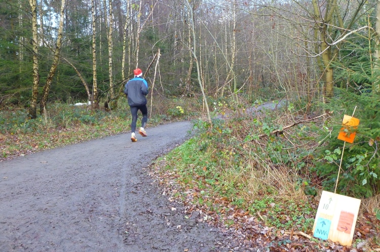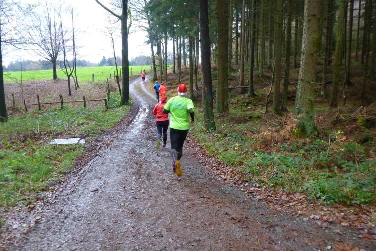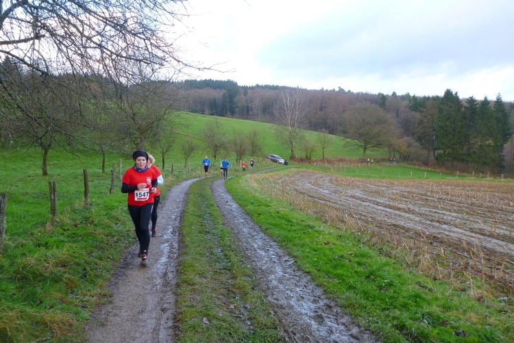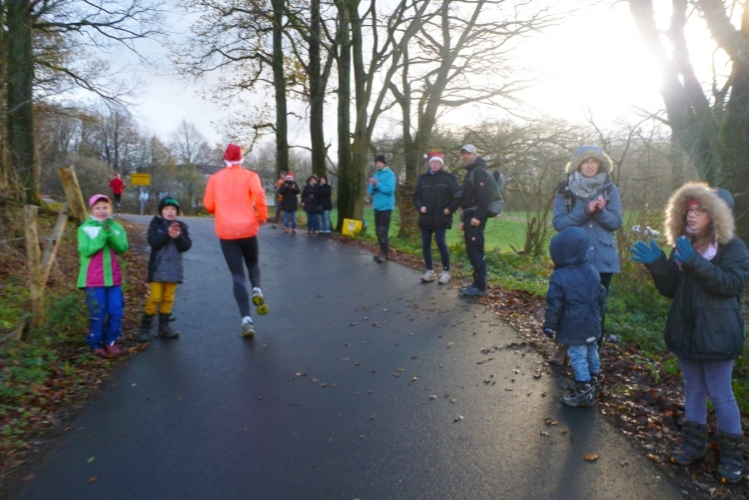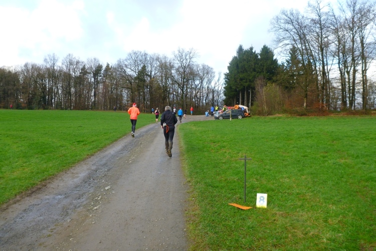 Das Auf und Ab hält sich eine Weile in Grenzen. Es geht rechts ab für die Nordic Walker, wir bleiben auf der Spur geradeaus. Eine zweite VS offeriert Glühwein. Die Hälfte ist fast geschafft. Ein Blick auf die Uhr bei Km 5 lässt mich auf eine Zeit von weniger als eine Stunde hoffen.
