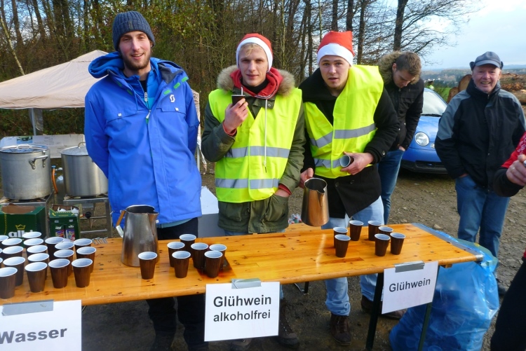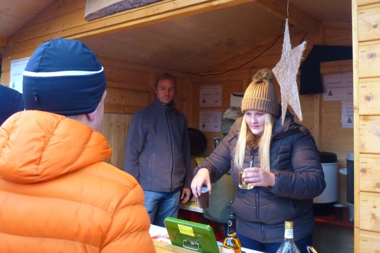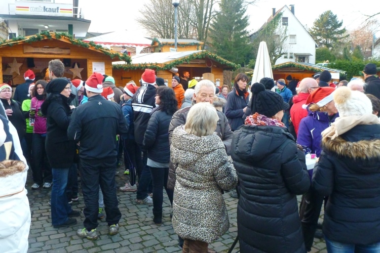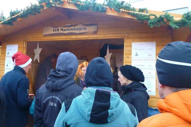 Derart gestärkt gehen wir ca. 500m zum Parkplatz in der Ortsmitte, legen die Taschen ins Auto und gehen auf den benachbarten Weihnachtsmarkt. Es gilt den Bon aus der Startertüte einzulösen. An der Hütte des VFR Marienhagen herrscht Andrang, der Glühwein kommt offensichtlich an. Auf der Bühne werden bald die Sieger geehrt.