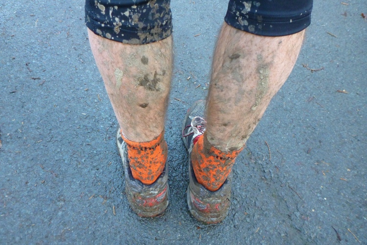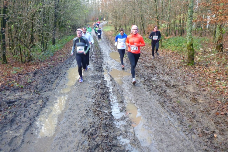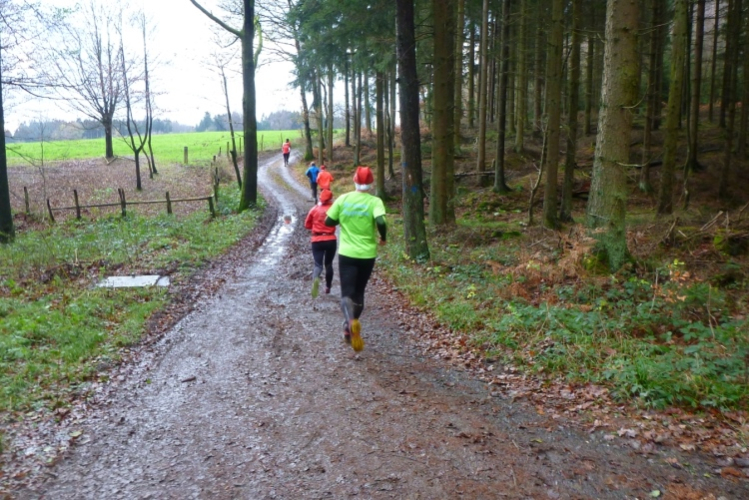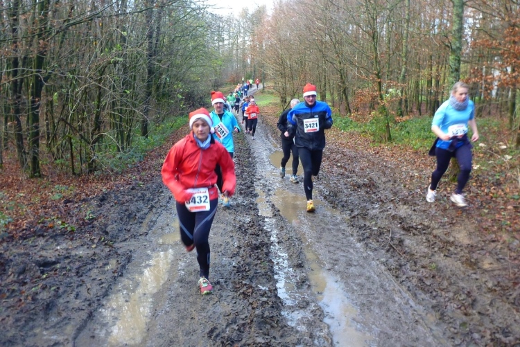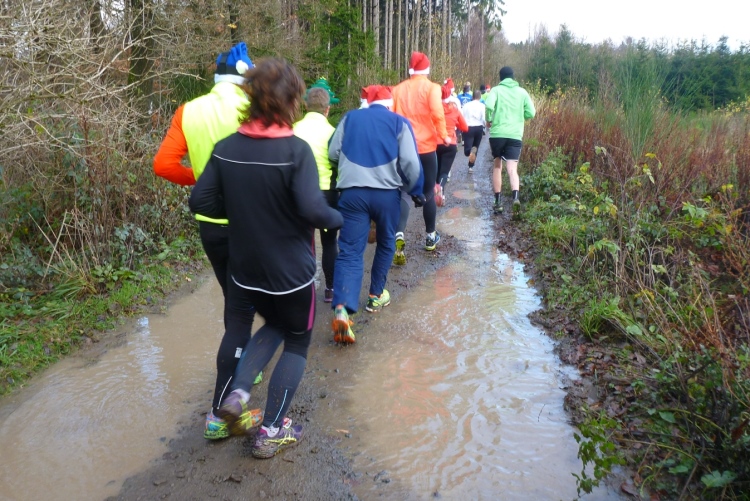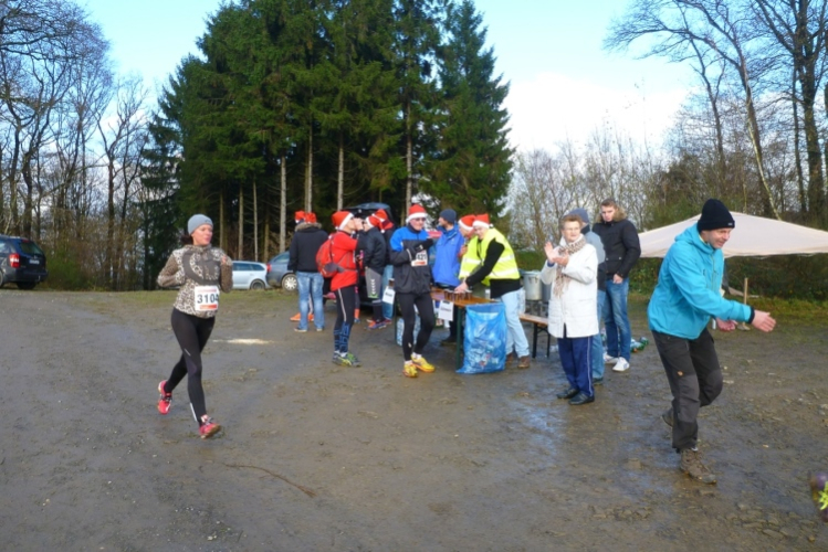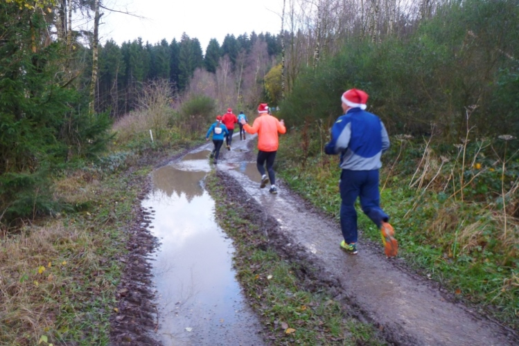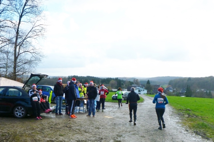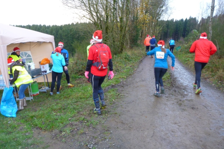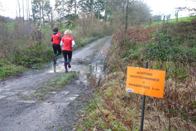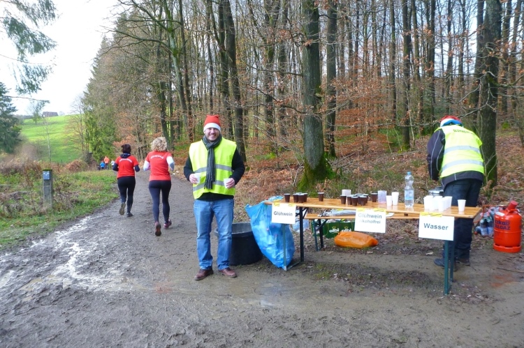 Kurz vor Km 2 kommt die erste Verpflegung. Und was gibt es? Klar, Glühwein mit und ohne Alkohol. Dazu Wasser. Und weiterhin Pfützen und Matsch. Herrlich, macht Spaß hier zu laufen. Leider macht der Akku in der Kamera schlapp. Kurzer Wechselstopp und weiter gehts.
