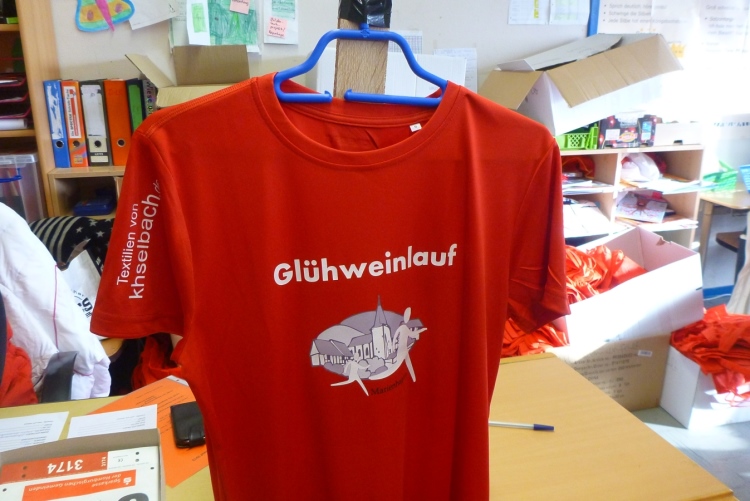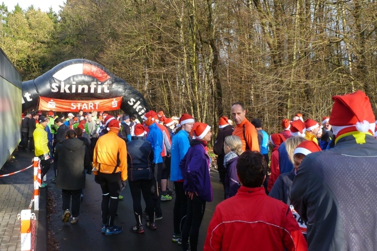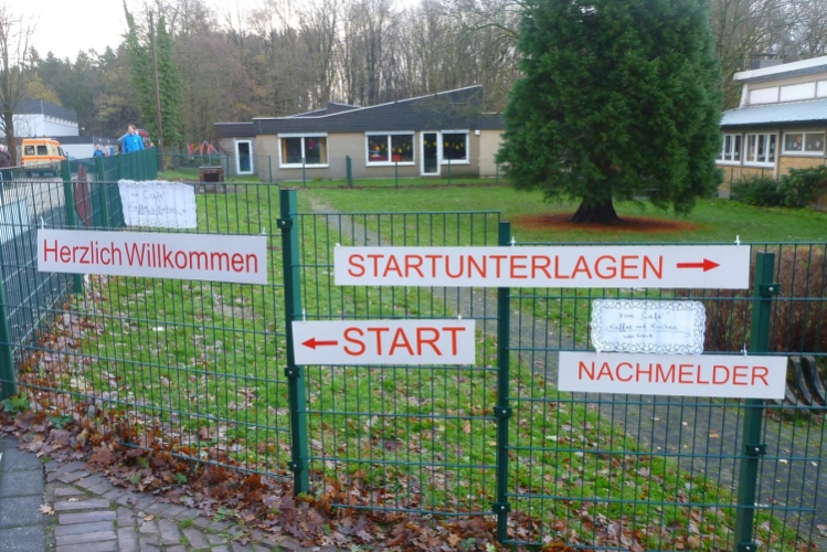Nach dem Genuss des Kuchens gehen wir in der Grundschule eine Etage tiefer und ziehen uns um. Die Taschen können wir an der Kleiderabgabe deponieren. Auf dem Kopf tragen wir eine Nikolausmütze. Die gibt es traditionell im Starterbeutel, wie auch einen Gutschein für einen Glühwein am Stand des Veranstalters, des VFR Marienhagen, auf dem Marienhagener Weihnachtsmarkt.