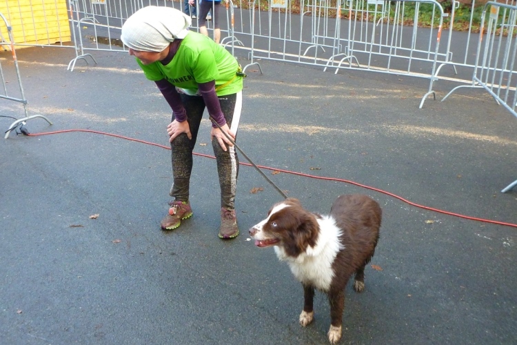 Der erste Kilometer ist geschafft. Bisher gibt es nur Asphalt, das wird sich bald ändern. Der Wald nimmt uns auf. Der Weg hat auch gleich ordentlich Morast und schöne Pfützen. Zwei weitere Läufer-Hund-Paare kommen in Sicht. Diesmal sind die Hunde angeleint und laufen nicht frei wie vorhin der Schäferhund.