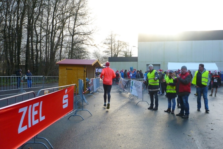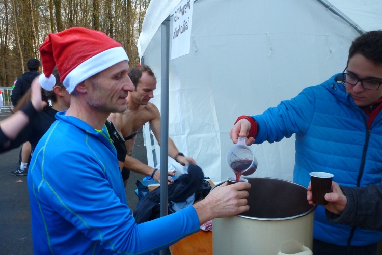 Ich freue mich, den Lauf deutlich unter einer Stunde beendet zu haben und genieße den warmen, alkoholfreien Kinderpunsch. Dieter ist schon im Ziel. Wir holen mit einem Becher Heißgetränk in der Hand unsere Taschen im Untergeschoß der Grundschule ab und gehen zur Dusche in der Sporthalle, direkt am Ziel. Ein Lauf der kurzen Wege. Die warme Dusche spült den Dreck von uns und ist wohltuend.