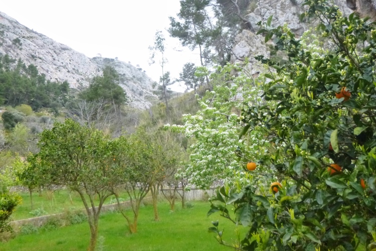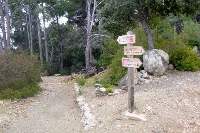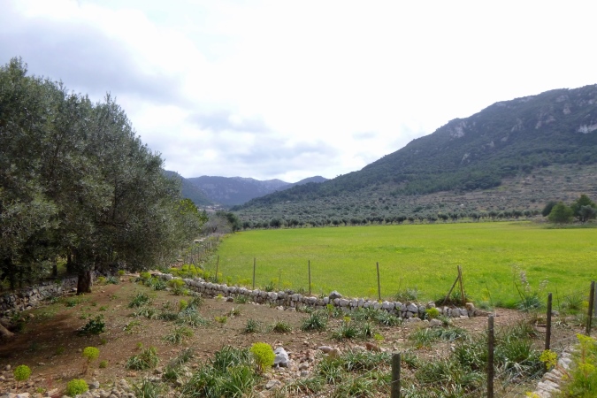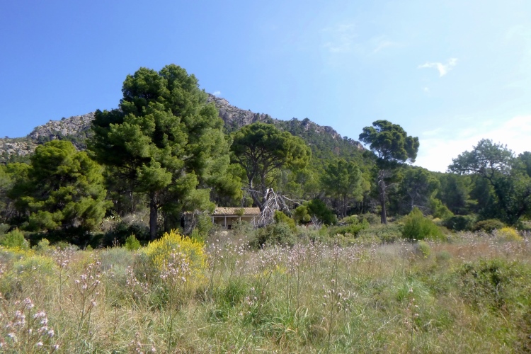 La Trapa, ein altes Kloster, lassen wir links liegen und arbeiten uns die Berge weiter hoch. Hier tauchen tatsächlich erste, sehr spärlich gesetzte Schilder des GR 221 auf. Nicht wirklich hilfreich bei unzähligen Kreuzungen. Also: GPS fragen. Bis Coll de Gramola geht’s prima, der Weg wandelt sich zur gut laufbaren Forststraße. Dann etwas Asphalt, am Treffpunkt bei 21 km wartet unser shuttle. Daneben die Finca ses Fontanelles.