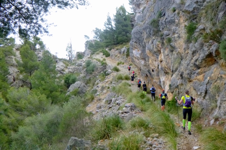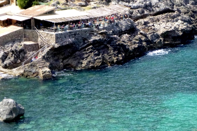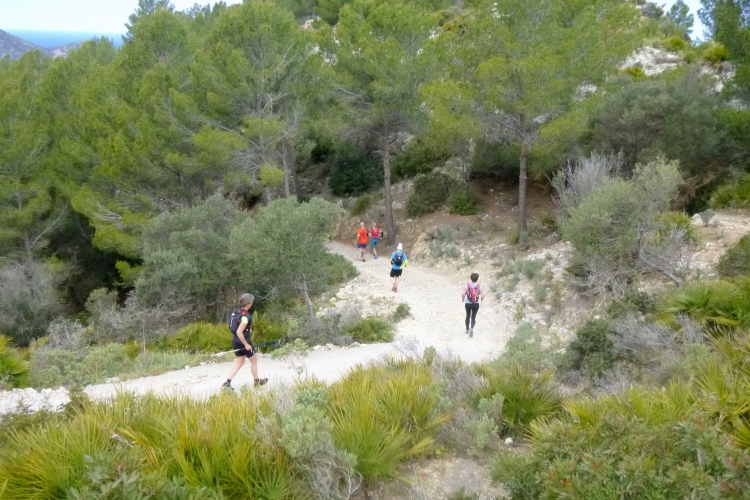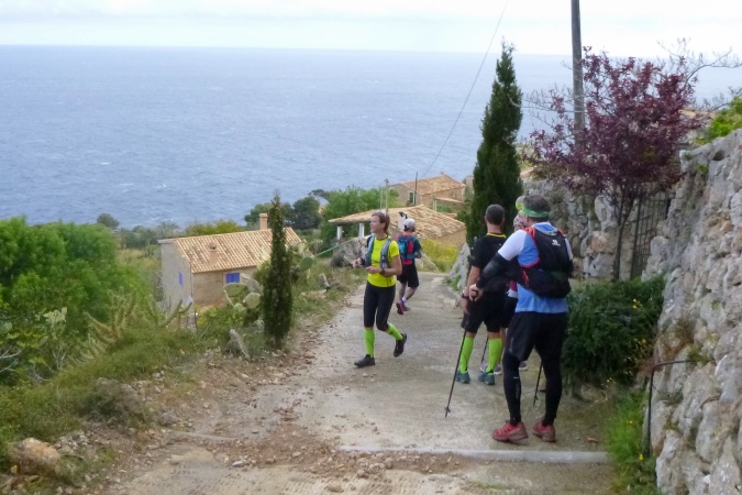 Kraft tanken nach eigenem Ermessen, heißt es hier. Alles ist lecker: Kuchen, Pizza, Nachtisch, egal was. Energie haben wir bitter nötig für die nächsten 5 km und 500 hm zum Caragoli-Plateau. Und natürlich wieder runter. Nach Cala Deia sind es weitere 6 km wilder Trail. Aber ohne mich: ich brauche etwas länger zum Regenerieren, lasse die anderen ziehen und bleibe im Shuttle bis zur Bucht. Dabei verpasse ich zwar den alpinen und wunderbaren Gratweg mit seiner endlosen Aussicht, kann aber den letzten Abschnitt für heute über Llucalcari bis Port de Soller wieder laufen. Schön den Schildern nach, ab hier ist es einfach und gut zu finden.